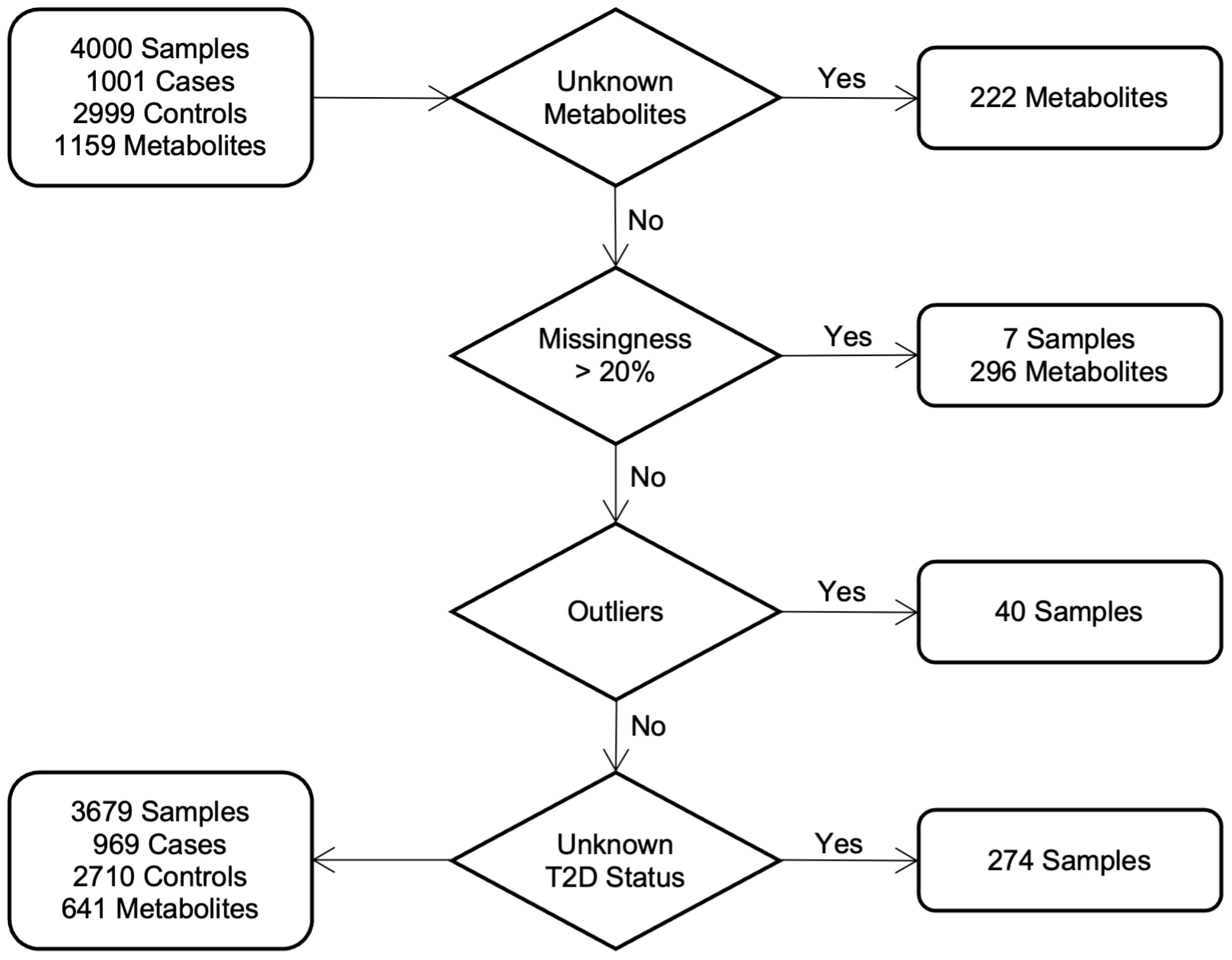 Flowchart illustrating a filtration process for 4,000 samples. Starting with 1,001 cases, 2,999 controls, and 1,159 metabolites, the logic tree includes steps for unknown metabolites, data missingness over twenty percent, outliers, and unknown Type 2 Diabetes status. Outcomes include 222 metabolites filtered as unknown, 7 samples with 296 metabolites missing, 40 samples identified as outliers, and 274 samples with unknown diabetes status. The process concludes with 3,679 samples, including 969 cases, 2,710 controls, and 641 metabolites.