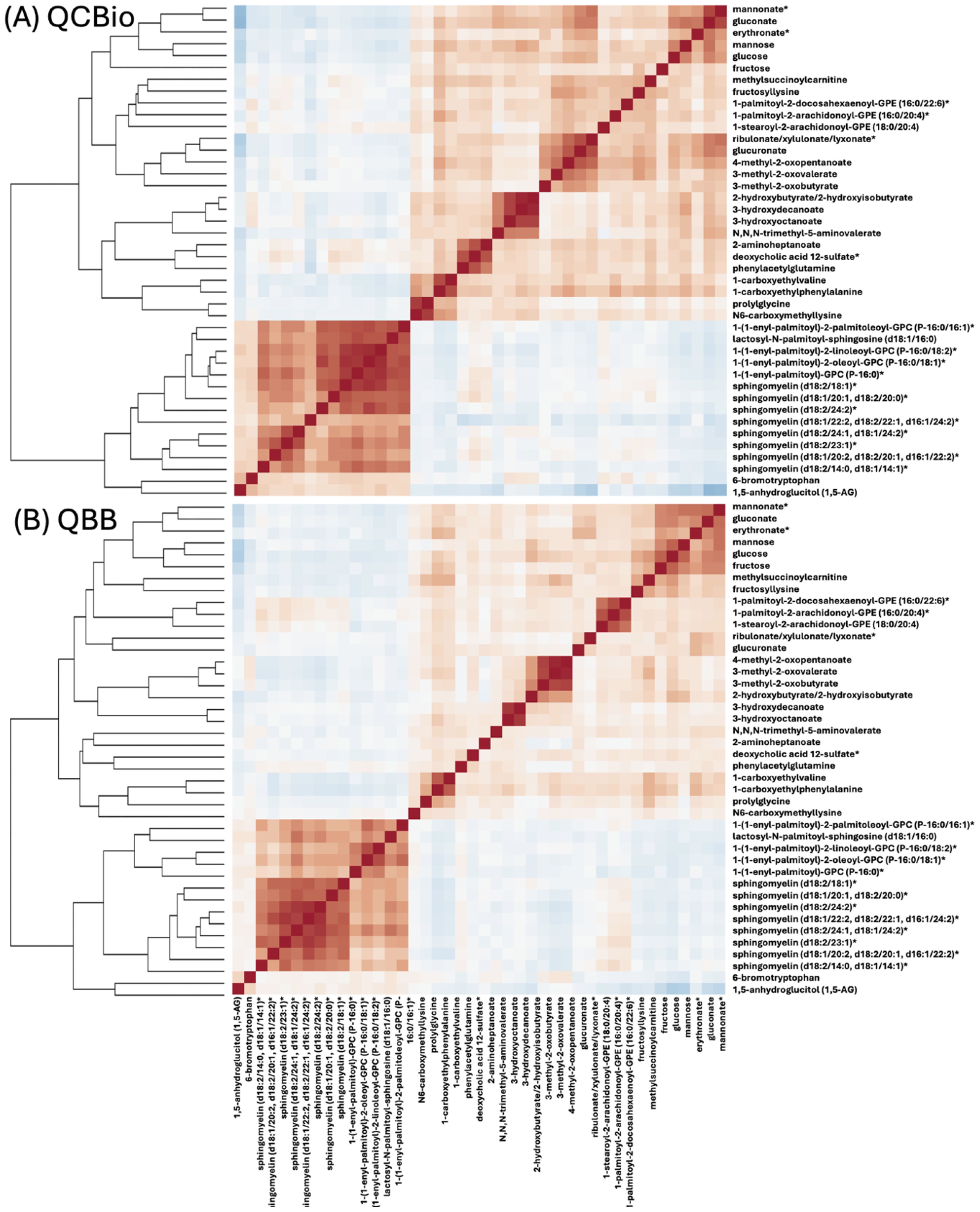 Two heatmaps labeled (A) QCBio and (B) QBB show hierarchical clustering and correlation data for different metabolites. Each heatmap has a dendrogram on the left indicating hierarchical relationships. The metabolites are listed on the right and bottom, with color gradients from red to blue representing correlation strength.