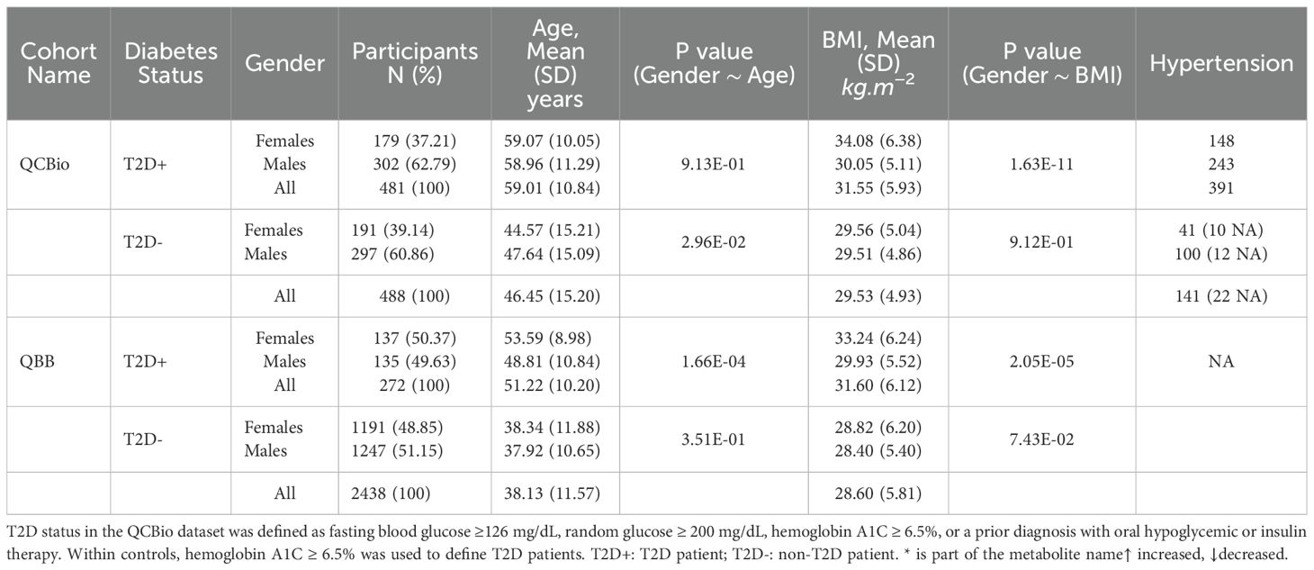 As indicated in Table 1, for QCBio cohort, the number of T2D patients was almost matched with non-T2D individuals and the females represent 38%, whereas the males represent 62%. For T2D patients, the age and BMI were statistically different between males vs females with P = 0.91 and P = 1.63 × 10−11, respectively. The number of hypertension individuals was 391 patients. For non-T2D individuals, the age and BMI were statistically different between males vs females with P = 0.03 and P = 0.91, respectively. The number of hypertension individuals was 141 patients. For QBB cohort, the number of T2D patients was 272, whereas the non-T2D individuals was 2,438. The gender distribution was equal between females and males. The age and BMI were statistically different between T2D for females vs males with P = 1.66 × 10−4 and P = 2.05 × 10−5, respectively, whereas P = 0.35 and P = 0.07, respectively for non-T2D individuals. None of the QBB cohort individuals has hypertension.