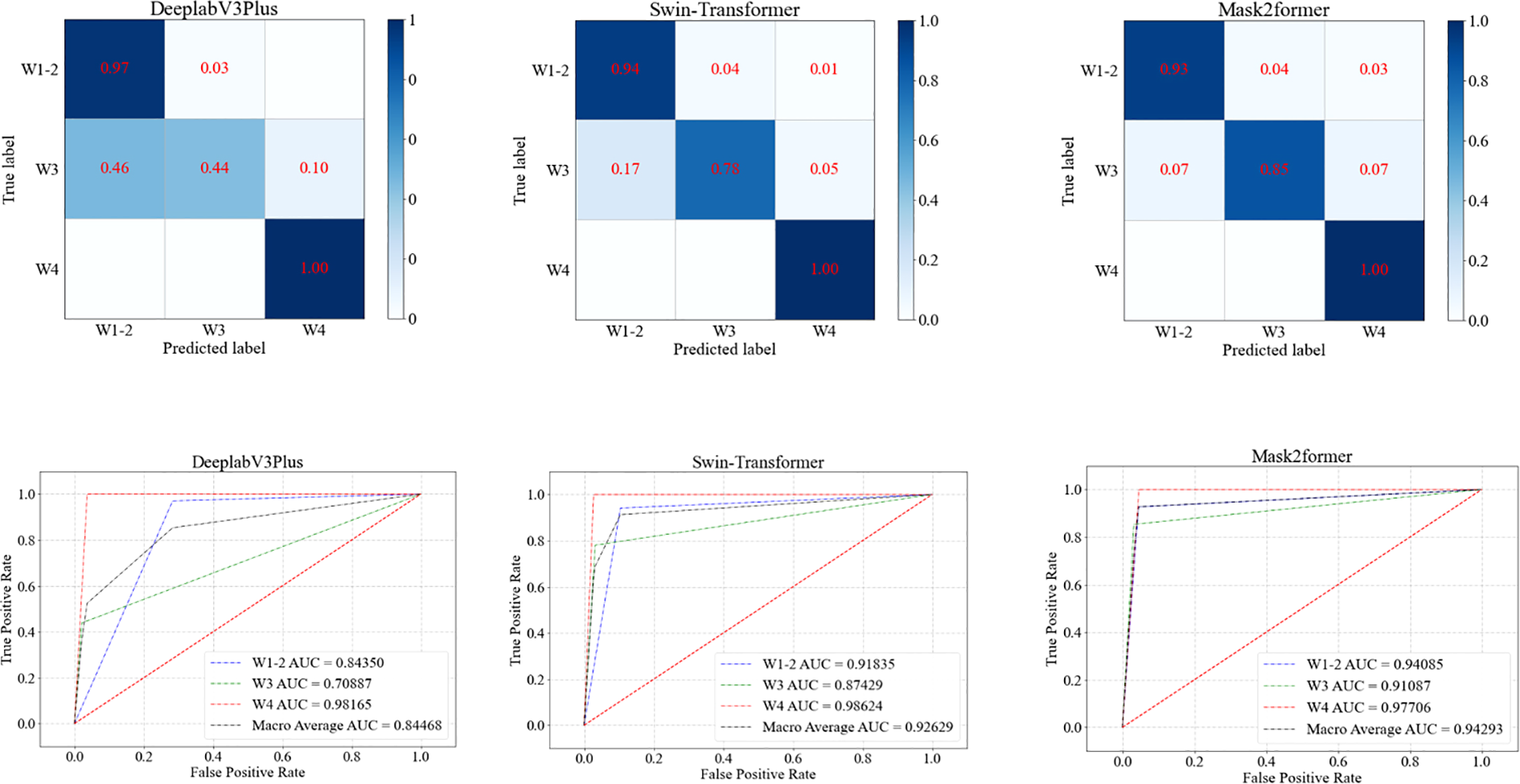 In the task of grading DFU, the Mask2Former model demonstrated the best overall performance (Table 4, Figure 5). The Mask2Former model exhibited high precision and specificity across all grade classification tasks and achieved the best results in overall accuracy (ACC) and AUC, with ACC at 0.9185 and AUC at 0.9429. The DeeplabV3Plus model achieved corresponding values of 0.8148 and 0.8447, while the Swin-Transformer model had an ACC of 0.9037 and an AUC of 0.9263. These results highlight the superior performance of the Mask2Former model in the grading diagnosis of DFU.