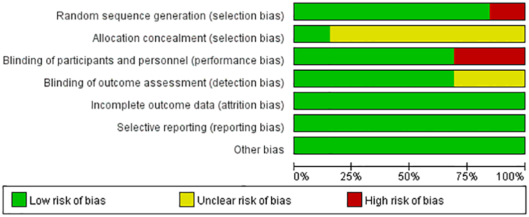 We reviewed the risk assessment of bias in the included literature. We found that no studies were registered on National ClinicalTrials.gov. Randomization was mentioned in all 13 literatures included in the study, of which 2 used computer randomization, 8 used random number table grouping, 1 used outpatient registration sequence grouping, and 2 used random grouping, but no specific explanation was given. Two studies performed the assignment concealment and blind method by using placebo. Of the 13 studies, 11 were identified as having a moderate risk of bias and two were identified as having a low risk of bias. Figures 2, 3 report the bias risk of each study.