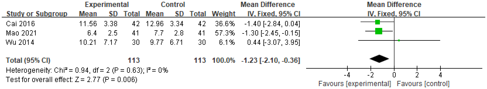 A total of 3 studies evaluated the effect of Xiangshao granules on Kupperman score. A meta-analysis was performed on 3 studies. There was no significant heterogeneity among the included studies (I2 = 0%, P= 0.63), so fixed effects model was used for analysis. The results showed that compared with HRT alone, there was a statistically significant difference in Kupperman score of Xiangshao granules (MD=-1.23, 95%CI[-2.10,-0.36], P<0.05), suggesting that Xiangshao granules could reduce Kupperman score. The forest plot is shown in Figure 5.