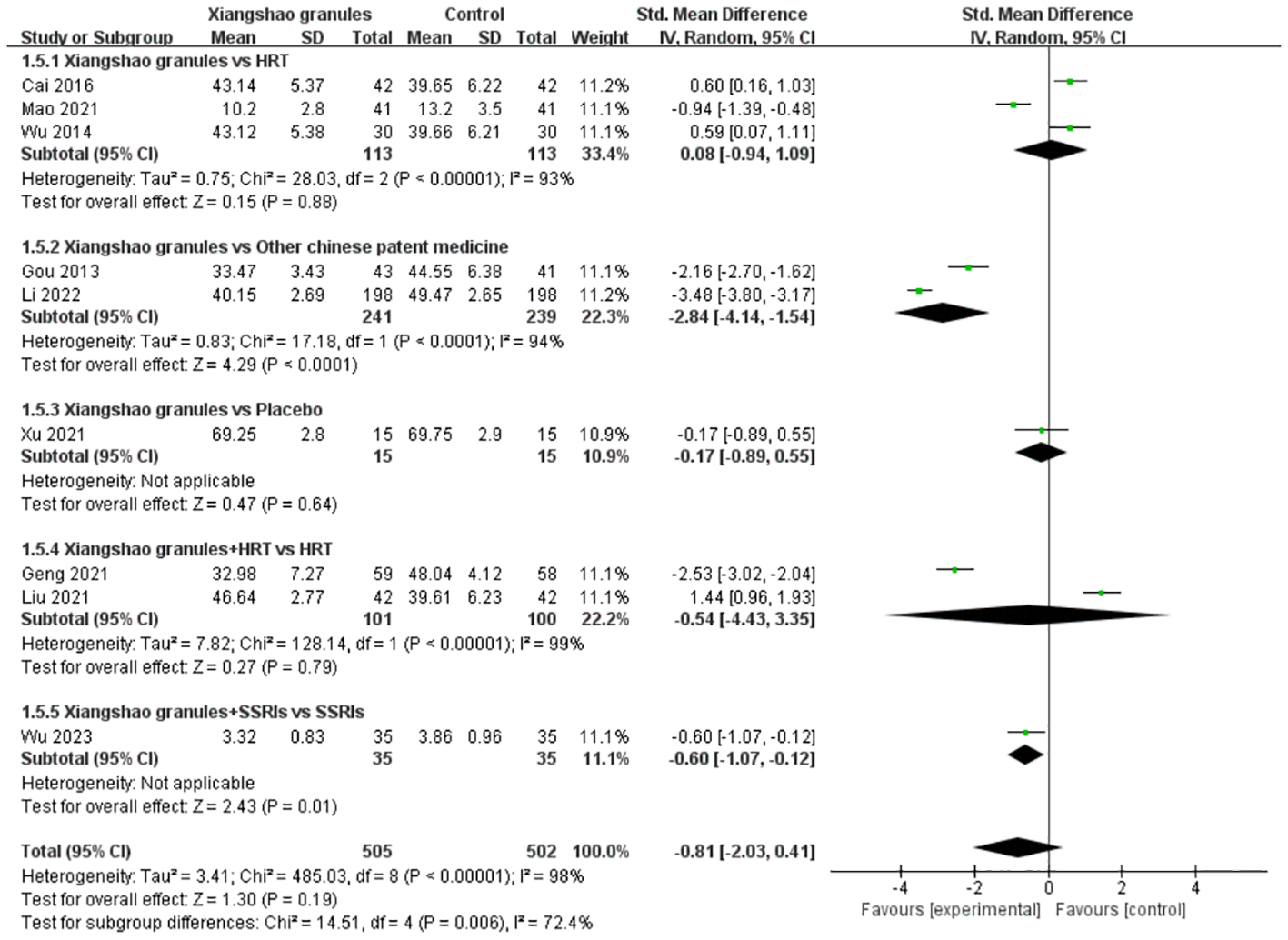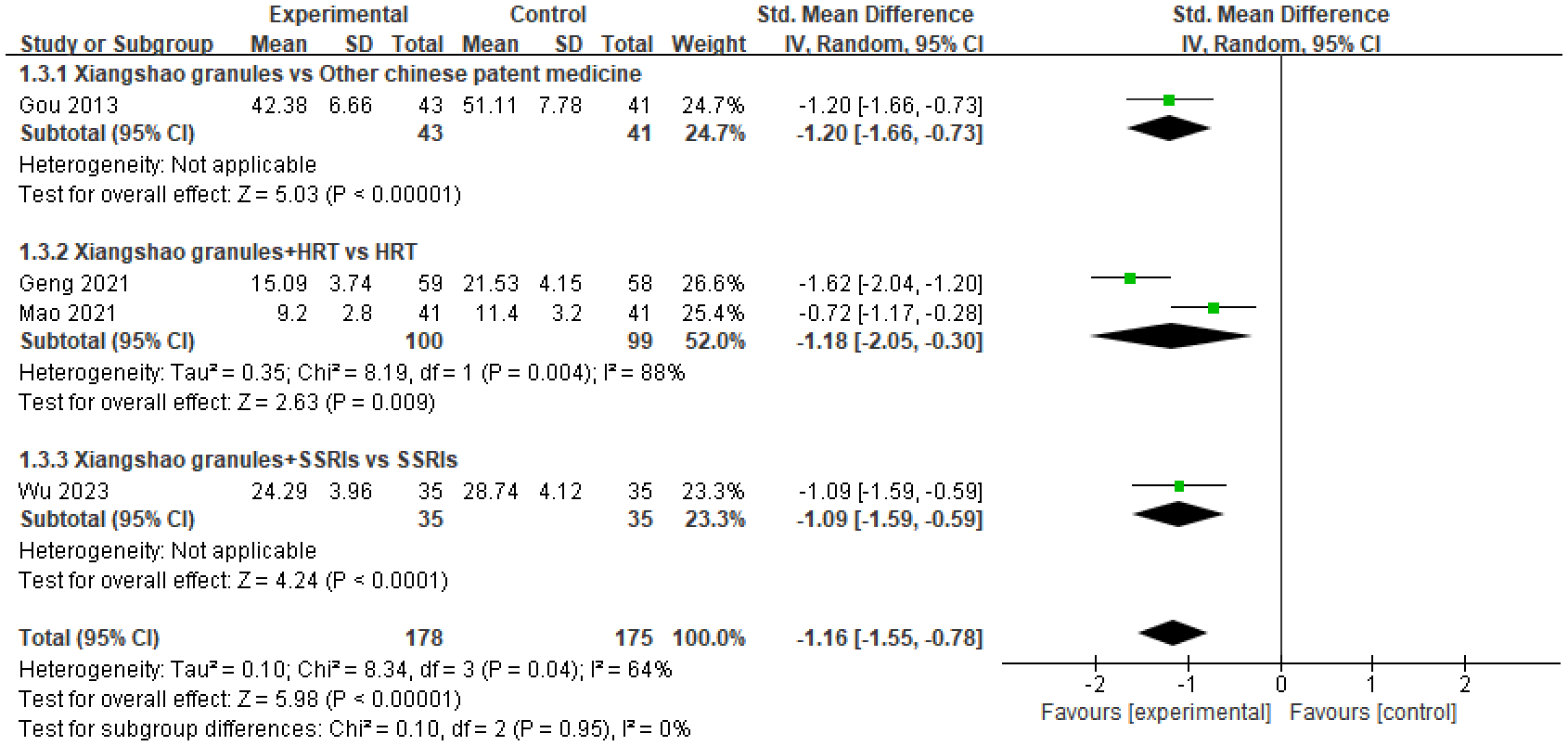 A total of 4 studies assessed LH levels. A meta-analysis was performed on 4 studies. There was a large heterogeneity among the studies (I2 = 64%, P=0.04), so the random effects model was used for analysis. The results showed that there was a statistically significant difference between the two groups on LH levels (SMD=-1.16, 95%CI[-1.55,-0.78], P < 0.05), suggesting that Xiangshao granules could reduce LH levels in MPS patients. Subgroup analysis, compared with other proprietary Chinese medicines, the difference was statistically significant (SMD=-1.20, 95%C[-1.66,-0.73]I, P<0.05). In addition, compared with HRT or SSRIs alone, the combined use of western medicine and Xiangshao granules can reduce LH levels in MPS patients (SMD=-1.18, 95%CI[-2.05,-0.30], P<0.05) (SMD=-1.09, 95%CI[-1.59, -0.59]. P<0.05). The forest plot is shown in Figure 6.