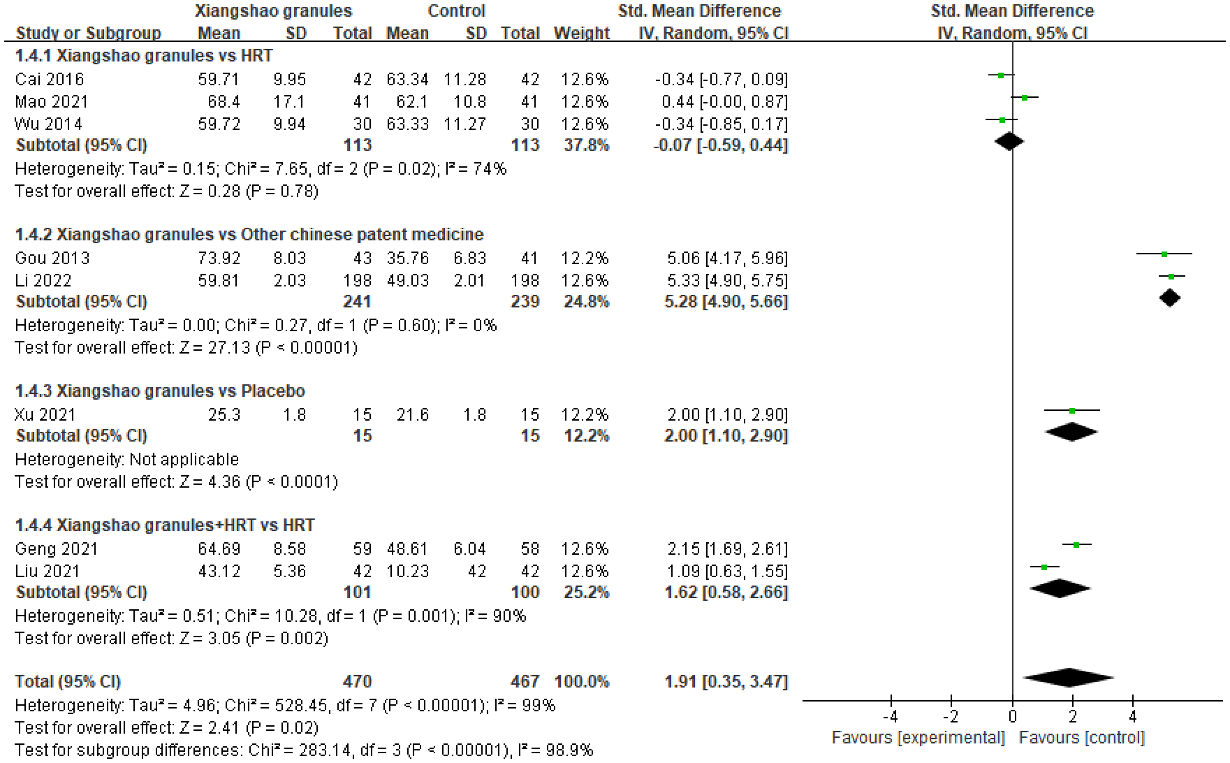 A total of 8 studies assessed E2 levels. A meta-analysis of 8 studies was performed. There was heterogeneity among the studies (I2 = 99%, P<0.00001), so the random effects model was used for analysis. The results showed that there was a statistically significant difference in E2 levels between the two groups (SMD=1.91, 95%CI[0.35, 3.47], P<0.05), suggesting that Xiangshao granules could improve E2 levels in MPS patients. By subgroup analysis, there was no statistically significant difference in E2 level between Xiangshao granules and HRT alone (SMD=-0.07, 95%CI[-0.59, 0.44], P= 0.78). However, compared with other proprietary Chinese medicines or placebo, there was no significant difference in E2 level between Xiangshao granules and HRT alone. There were significant differences in E2 levels (SMD=5.28, 95%CI[4.90, 5.66], P<0.05) (SMD=2.00, 95%CI[1.10, 2.90], P<0.05). In addition, the combination of HRT and Xiangshao granules increased E2 levels in MPS patients compared with HRT alone. (SMD=1.62, 95%CI[0.58, 2.66], P<0.05). The forest plot is shown in Figure 7.