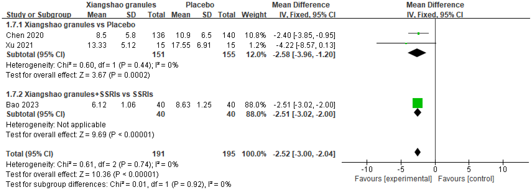 A total of 3 studies assessed HAMA scores. A meta-analysis of 3 studies was performed. There was no heterogeneity among the studies (I2 = 0%, P=0.74), so the fixed-effect model was used for analysis. The results showed that there was a statistically significant difference in HAMA scores between the two groups (MD=-2.52, 95%CI[-3.00,-2.04], P<0.05), suggesting that Xiangshao granules could reduce HAMA scores. Subgroup analysis showed that there was significant difference in HAMD score between Xiangshao granules and placebo (MD=-2.58, 95%CI[-3.96,-1.20], P<0.05). In addition, compared with SSRIs alone, the combined use of SSRIs and Xiangshao granules reduced HAMD scores (MD=-2.51, 95%CI[-3.02,-2.00],P<0.05). The forest plot is shown in Figure 10.