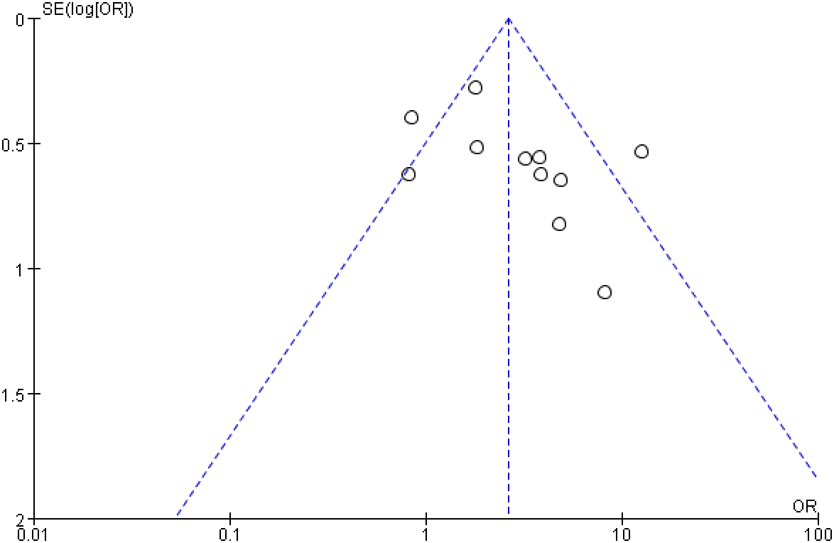 A total of 11 studies evaluated the overall efficacy of Xiangshao granules in treating MPS. A meta-analysis of 11 studies was performed. The heterogeneity among the included studies was large (I2 = 61%, P=0.004), so the random effects model was used for analysis. The results showed that there was a statistically significant difference in the total effective rate between the two groups (OR= 2.78, 95%CI[1.65, 4,68], P<0.05), suggesting that Xiangshao granules could improve the total effective rate of MPS treatment. Subgroup analysis showed that there was no statistically significant difference in the total effective rate of Xiangshao granules compared with HRT alone (OR=-1.30, 95%CI[0.52, 3.29], P= 0.10), but compared with other Chinese patent medicines or placebo, The difference was statistically significant (OR=4.79, 95%CI[1.44, 15.95], P<0.05) (OR=1.79, 95%CI[1.03, 3.11], P<0.05). In addition, compared with HRT OR SSRIs alone, the combined use of western medicine and Xiangshao granules improved the total effective rate(OR=4.42, 95%CI[1.67, 11.66], P<0.05) (OR=3.65, 95%CI[1.46, 9.11], P<0.05). The forest map is shown in Figure 4.