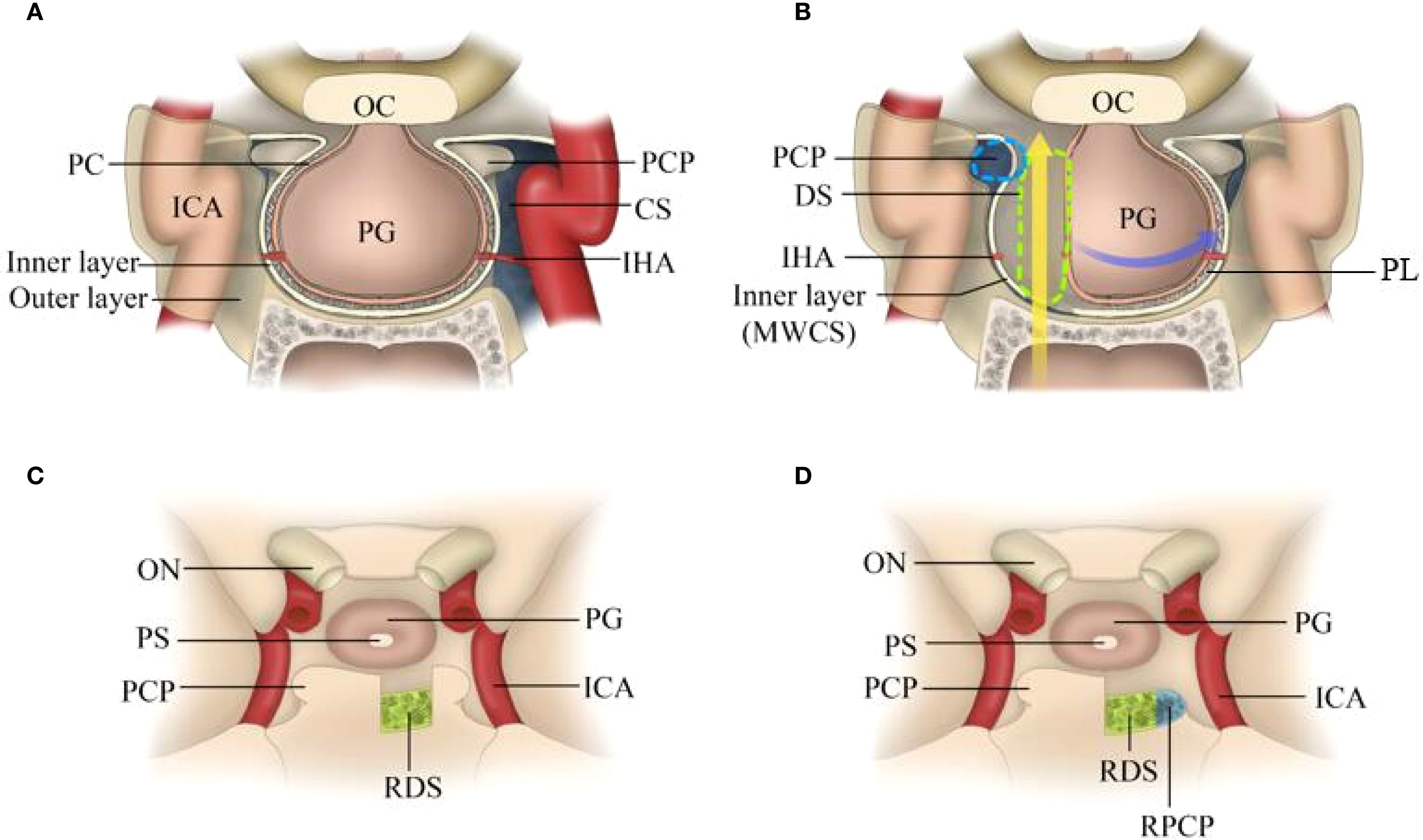 Figure 1. Schematic of intradural pituitary transposition and bone removal. (A) Illustration showing the membrane structure of the PG (three layers in the anterior-posterior-superior-inferior walls and two layers in both lateral walls). (B) Illustration showing the corridor between the pituitary capsule and the MWCS. After the dura was incised and the “pituitary ligaments” were split, the ipsilateral IHA was cut, and the PG and PS were displaced and rotated anteriorly and contralaterally to provide necessary access for the resection of the DS and PCPs. (C) Illustration showing that the DS was resected with PCPs preserved. (D) Illustration showing that the DS and ipsilateral PCP were resected. OC, optic chiasma; PG, pituitary gland; PCP, posterior clinoid process; CS, cavernous sinus; IHA, inferior hypophyseal arteries; MWCS, medial wall of the cavernous sinus; PL, pituitary ligament; ON, optic nerve; PS, pituitary stalk; RDS, right dorsum sellae; RPCP, right posterior clinoid process.