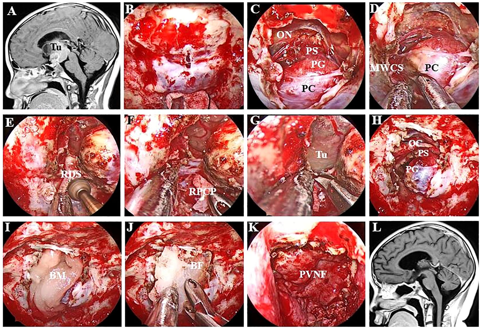 Figure 2. Endoscopic endonasal view of the procedure and nuances of intradural PGT. (A) Preoperative MR image showing a large craniopharyngioma in the retroinfundibular area. (B) A longitudinal dural incision was made at the site of the sellar tubercle. (C) The dura mater was extended upwards and downwards without injuring the pituitary capsule. (D) The pituitary ligament between the MWCS and the pituitary capsule was excised, after which the PG was displaced laterally. (E) The DS was resected via high-speed drilling, and the clival dura was exposed. (F) The right PCS was removed to provide more space for manipulation inside the interpeduncular cistern. (G) The clival dura was cut downwards to expose the tumour more effectively. (H) The structure of the PG and optic chiasma was intact after complete tumour resection. (I) An absorbable artificial biomembrane was placed as the first step. (J) An in situ bone flap was placed on the biomembrane for complete osseous reconstruction. (K) A vascularized pedicled nasoseptal flap was used to repair the defect. (L) MRI revealed no residual tumour or recurrence. Tu, tumour; ON, optic nerve; PS, pituitary stalk; PG, pituitary gland; PC, pituitary capsule; MWCS, medial wall of the cavernous sinus; RDS, right dorsum sellae; RPCP, right posterior clinoid process; BM, biomembrane; BF, bone flap; PVNF, pedicled vascularized nasoseptal flap.