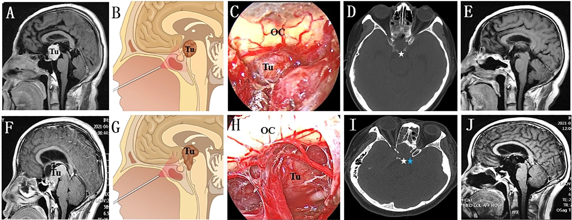 Figure 3. Endoscopic endonasal intradural pituitary transposition for resecting retroinfundibular lesions. (A, B) The tumour is located retroinfundibularly and extends inferiorly into the prepontine areas. (C) The infrachiasmatic space was narrow, and the tumour was blocked by the PG and DS. (D) The DS was individually drilled out (white arrow) and confirmed by a postoperative thin-layer CT scan. (E) Follow-up MR image showing that the tumour was radically resected. (F, G) This retroinfundibular tumour was very large and occupied both the prepontine and interpeduncular cisterns. (H) Except for the DS, the surgical corridor was effectively enlarged by removing the left PCP. (I) The left DS (white arrow) and PCP (blue arrow) disappeared on the postoperative thin-layer CT scan. (J) Follow-up MR image showing no residual tumour or occurrence. Tu, tumour; OC, optic chiasma.