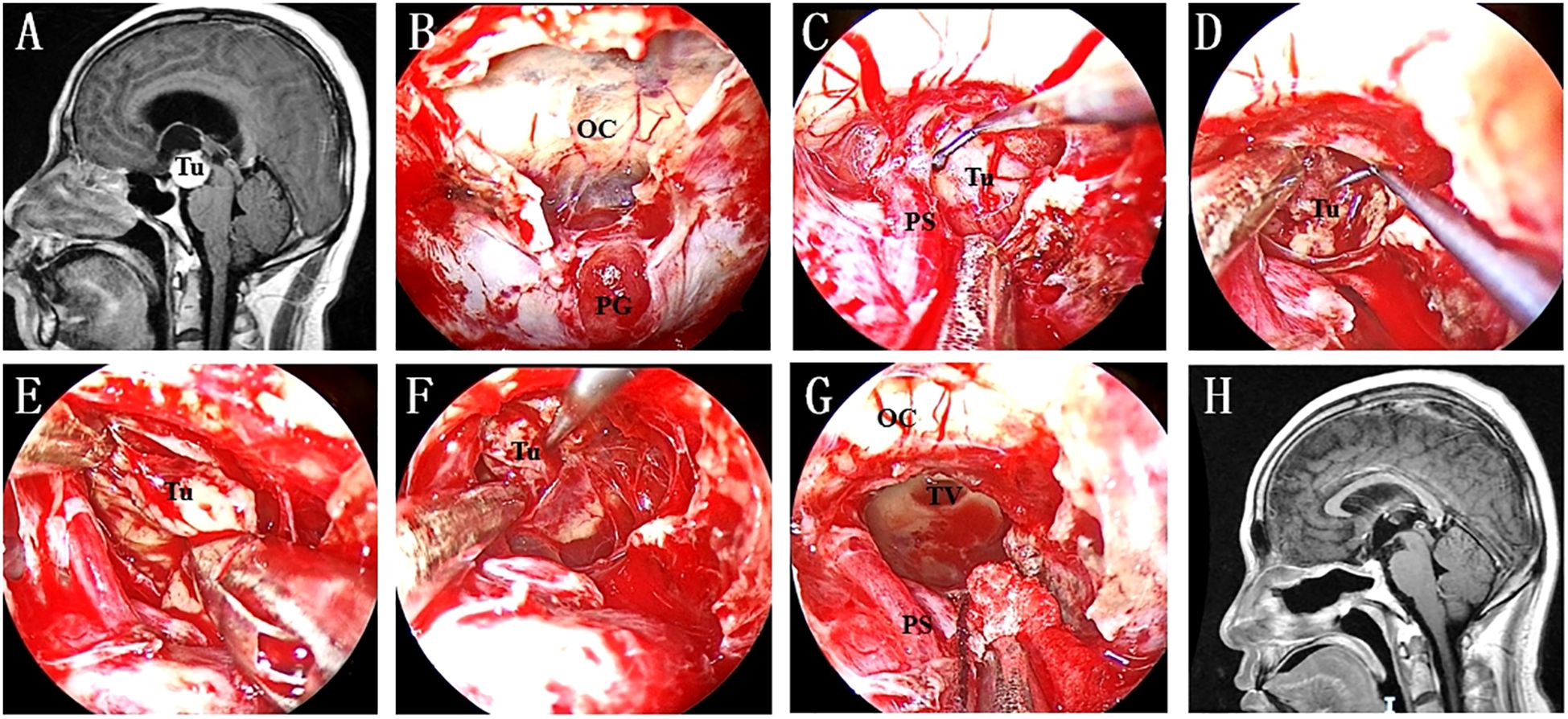 Figure 4. (A) Preoperative MR image showing a lesion in the retroinfundibular area. (B) A “Y”-shaped dural incision was made to expose the PG and optic chiasma. (C) The lesion was exposed after intradural PGT and clival dura opening. (D) Intratumoral debulking was performed as the first step to ensure extensive tumour resection. (E) The medial interface was identified after enough tumour debulking. (F) Inferior extracapsular dissection was continued to achieve radical tumour resection. (G) The TV was opened after the tumour was completely resected. (H) No residual tumour or recurrence was found on postoperative MRI. Tu, tumour; OC, optic chiasma; PG, pituitary gland; PS, pituitary stalk; TV, third ventricle.