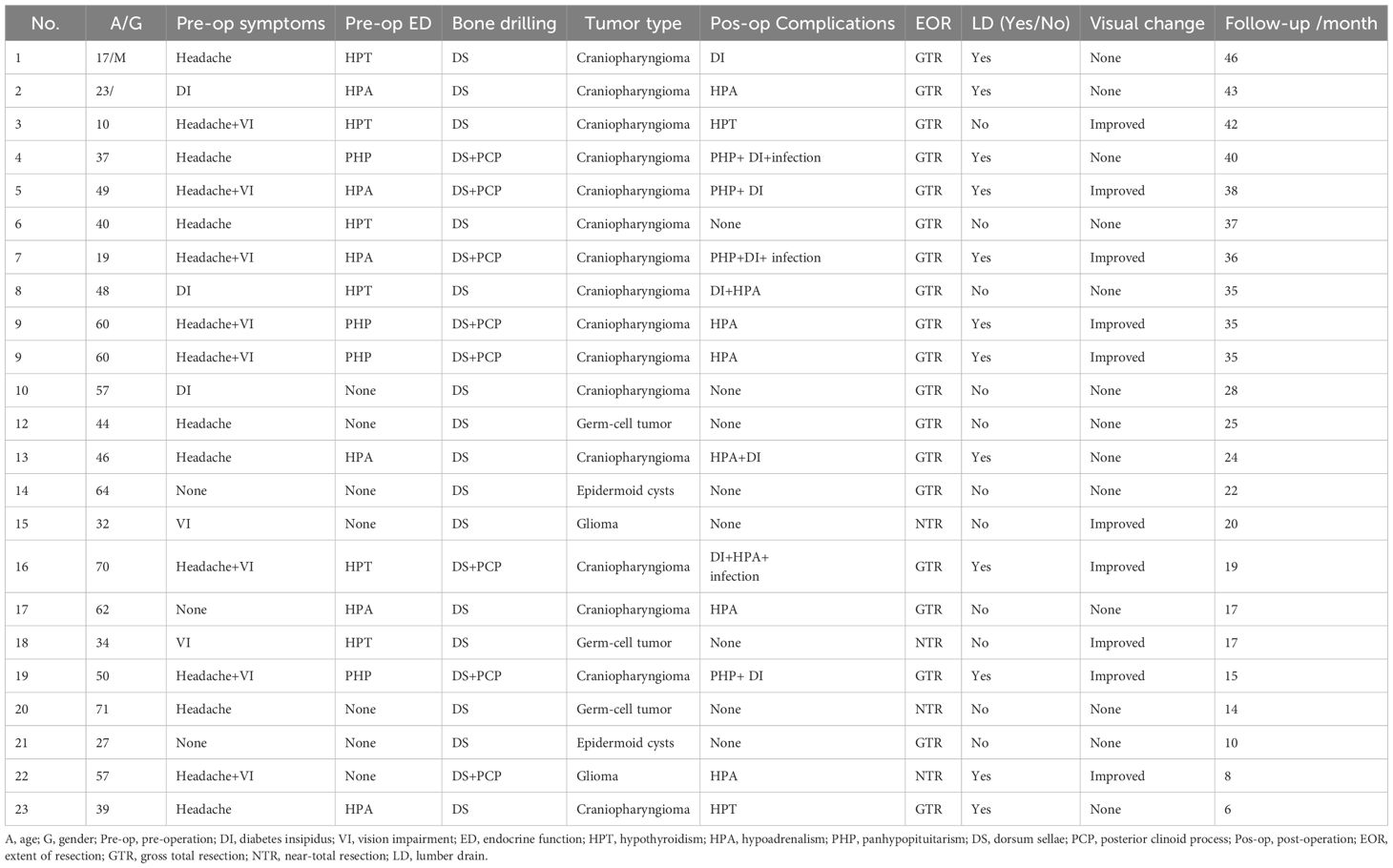 Results: Among the 23 patients with tumours, 16 had craniopharyngiomas, 3 had germ cell tumours, 2 had epidermoid cysts, and 2 had gliomas. Fifteen patients underwent unilateral PGT and ipsilateral dorsectomy, and 8 patients underwent ipsilateral posterior clinoidectomy. Ten patients with visual impairment improved, and none of the patients experienced cranial nerve palsy postoperatively. Fourteen patients developed hypopituitarism, and 8 patients experienced diabetes insipidus (DI) postoperatively, 6 and 4 of theses patients recovered after 2–4 weeks of replacement therapy. Twelve patients with intraoperative high-flow CSF leakage underwent an average of 7 days of early postoperative lumbar drain (LD). Among them, 4 patients developed an infection, which was cured by 10 days of antibiotic treatment combined with LD. None of the patients experienced constant CSF leakage at the discharge. Gross total resection (GTR) was achieved in 19 tumour patients, and near-total resection (NTR) was achieved in 4 patients. The average follow-up period was 26 months, and magnetic resonance imaging (MRI) revealed no tumour recurrence in 22 patients.