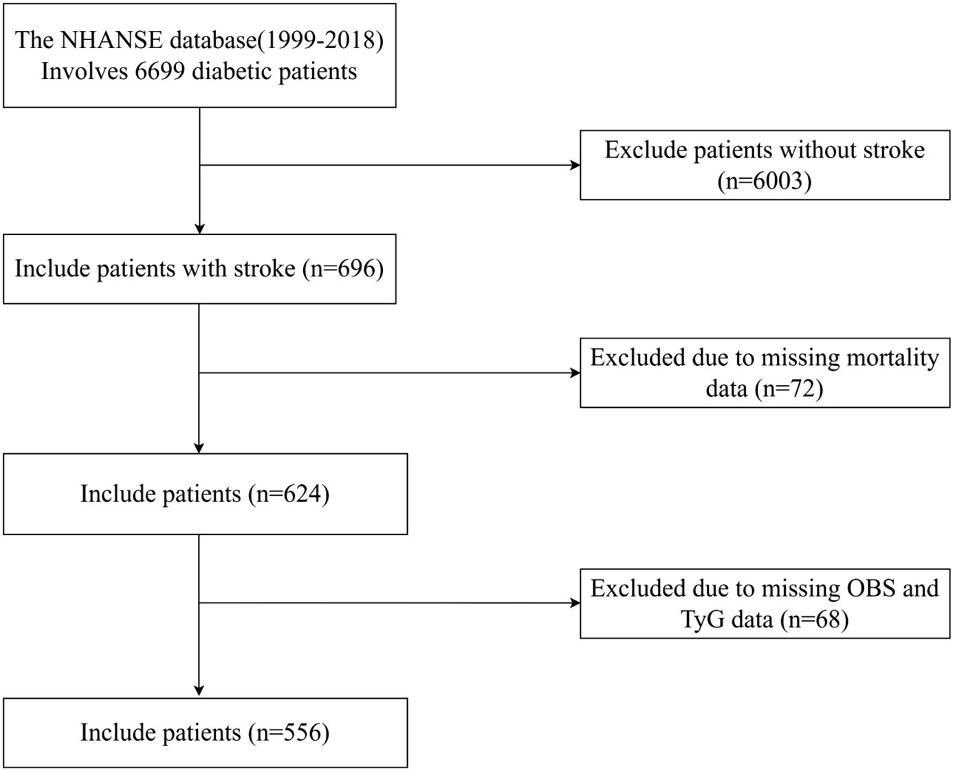 However, there have been no reports on the predictive ability of the TyG index in conjunction with OBS as a comprehensive indicator in diabetic patients with stroke. Considering the significant roles of insulin resistance and oxidative stress in the pathogenesis of stroke in diabetes, investigating the relationship between TyGBS and mortality in diabetic stroke holds crucial clinical relevance. This aids in early identification of high-risk individuals and provides a theoretical basis for developing personalized prevention and treatment strategies.