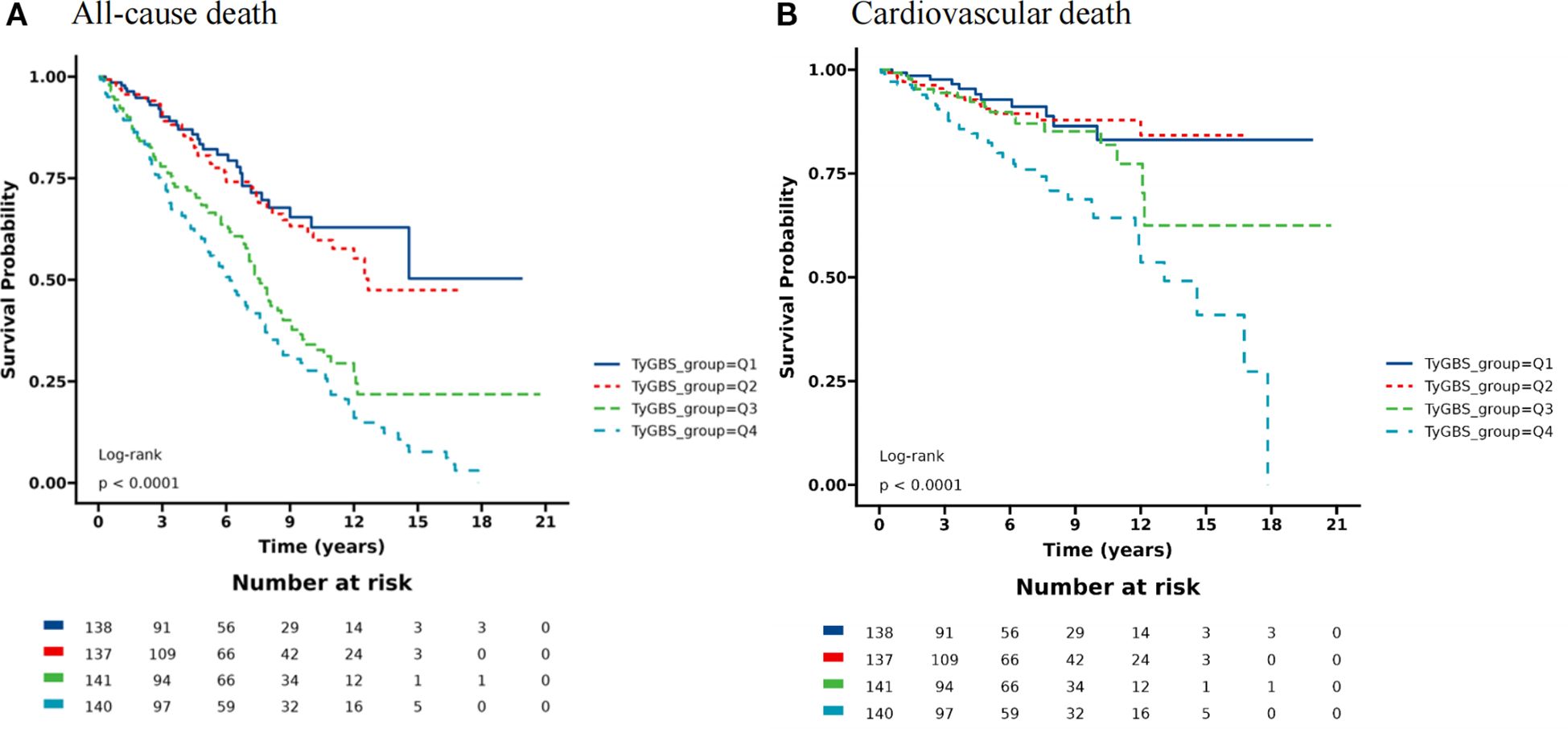 Figure 2. Kaplan-Meier curves for all-cause mortality (A) and cardiovascular mortality (B) among diabetic stroke patients stratified by quartiles (Q1-Q4) of TyGBS.