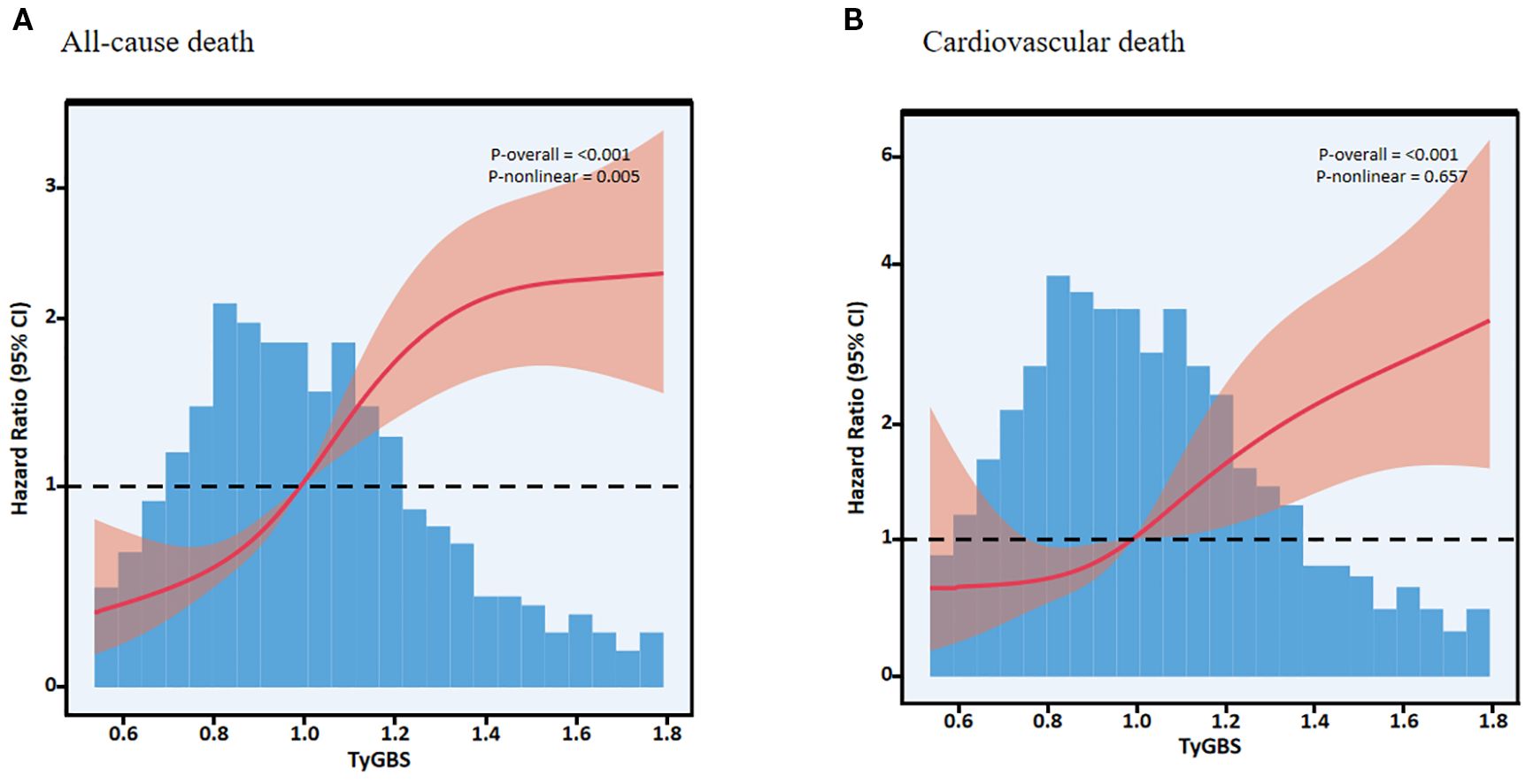 Figure 3. Restricted cubic spline curves showing the association of TyGBS with all-cause mortality (A) and cause-specific cardiovascular mortality (B) in diabetic stroke patients.