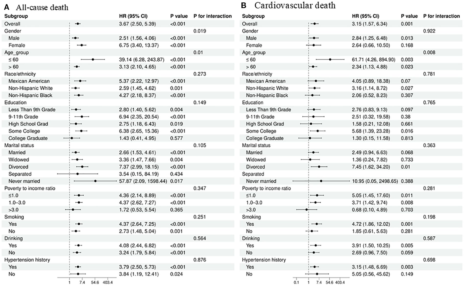 Figure 4. Subgroup analysis of the association between the TyGBS index and mortality outcomes in diabetic stroke patients: (A) all-cause mortality and (B) cardiovascular mortality.