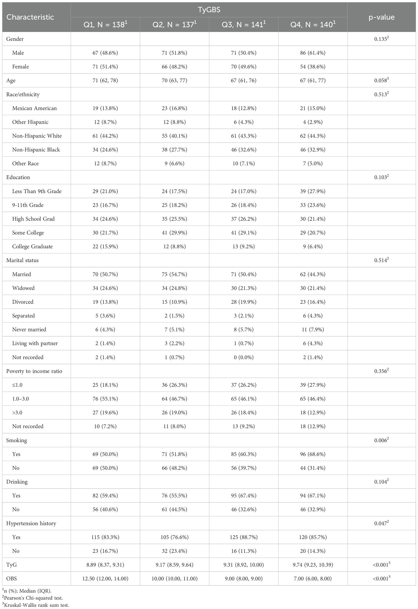 Table 1 presents the baseline characteristics of the study subjects, categorized according to quartiles of TyGBS. The study involved a total of 556 patients with diabetes comorbid with stroke. The average age of participants is 67.9 years (± 10.3), with the majority being non-Hispanic white. Compared to participants in the lowest quartile (Q1) of TyGBS, those in the highest quartile (Q4) are more likely to be males, younger, non-Hispanic whites, have less than 9 years of education, unmarried, experiencing higher levels of poverty, with a history of hypertension, and engaging in higher levels of alcohol consumption and smoking. The TyG index is high while the OBS score is low. There were statistically significant differences among the TyGBS groups in terms of smoking status, history of hypertension, TyG index, and OBS score.