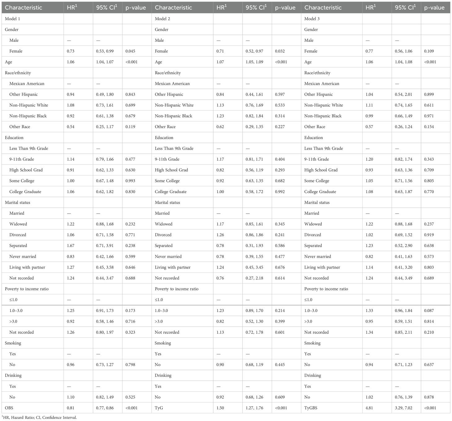 As shown in Table 2, this study constructed three different multivariate Cox regression models. In Model 1 (OBS), an increase in OBS is associated with a 19% decrease in the risk of all-cause mortality for each unit increase in OBS (HR 0.81, 95% CI 0.77-0.86, p < 0.001).In model 2 (TyG), for each unit increase in TyG, there is a significant 50% increase in the risk of all-cause mortality (HR 1.50, 95% CI 1.27-1.76, p < 0.001).In model 3 (TyGBS), there was a significant increase in the risk of all-cause mortality with each incremental rise in TyGBS (HR 4.81, 95% CI 3.29-7.02, p < 0.001).Comparing the performance of three Cox proportional hazards models in terms of fitting, prediction error, and model selection criteria, Model 3 (TyGBS) shows the best overall performance.