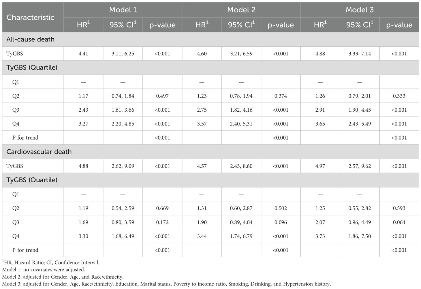 Results: Over a mean follow-up of 73 months, 210 (49.4%) patients died, including 65 (15.3%) from cardiovascular causes. Higher TyGBS levels were significantly associated with increased mortality risks. Kaplan-Meier analysis showed the lowest mortality in the lowest TyGBS quartile (Q1) and the highest in Q4 (log-rank p<0.001). Cox regression revealed that each unit increase in TyGBS raised all-cause mortality risk by 360% (HR 4.60, 95% CI 3.21–6.59) and cardiovascular mortality risk by 357% (HR 4.57, 95% CI 2.43–8.60). The RCS analysis indicated a nonlinear association, showing a significant increase in mortality risk when TyGBS was less than 1.163 (p for nonlinearity = 0.002).
