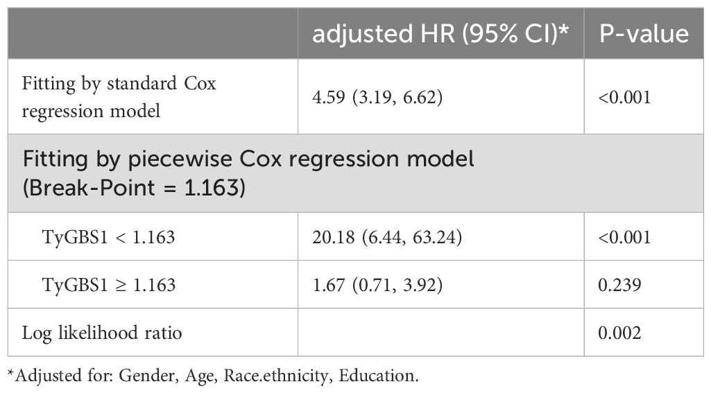 There is a curvilinear relationship between TyGBS and all-cause mortality, while there is no curvilinear relationship with cardiovascular mortality (Figure 3). The standard Cox regression analysis revealed a significant association between TyGBS and all-cause mortality (Table 4), with an adjusted hazard ratio of 4.59 (95% CI: 3.19-6.62, p<0.001). Piecewise regression identified a threshold effect at TyGBS=1.163. Below this threshold, TyGBS showed a strong positive association with mortality (adjusted HR = 20.18, 95% CI: 6.44-63.24, p<0.001), while no significant association was observed above the threshold (adjusted HR = 1.67, 95% CI: 0.71-3.92, p=0.239). The likelihood ratio test confirmed the superiority of the piecewise model over the standard Cox model (p=0.002), supporting the existence of a threshold effect.
