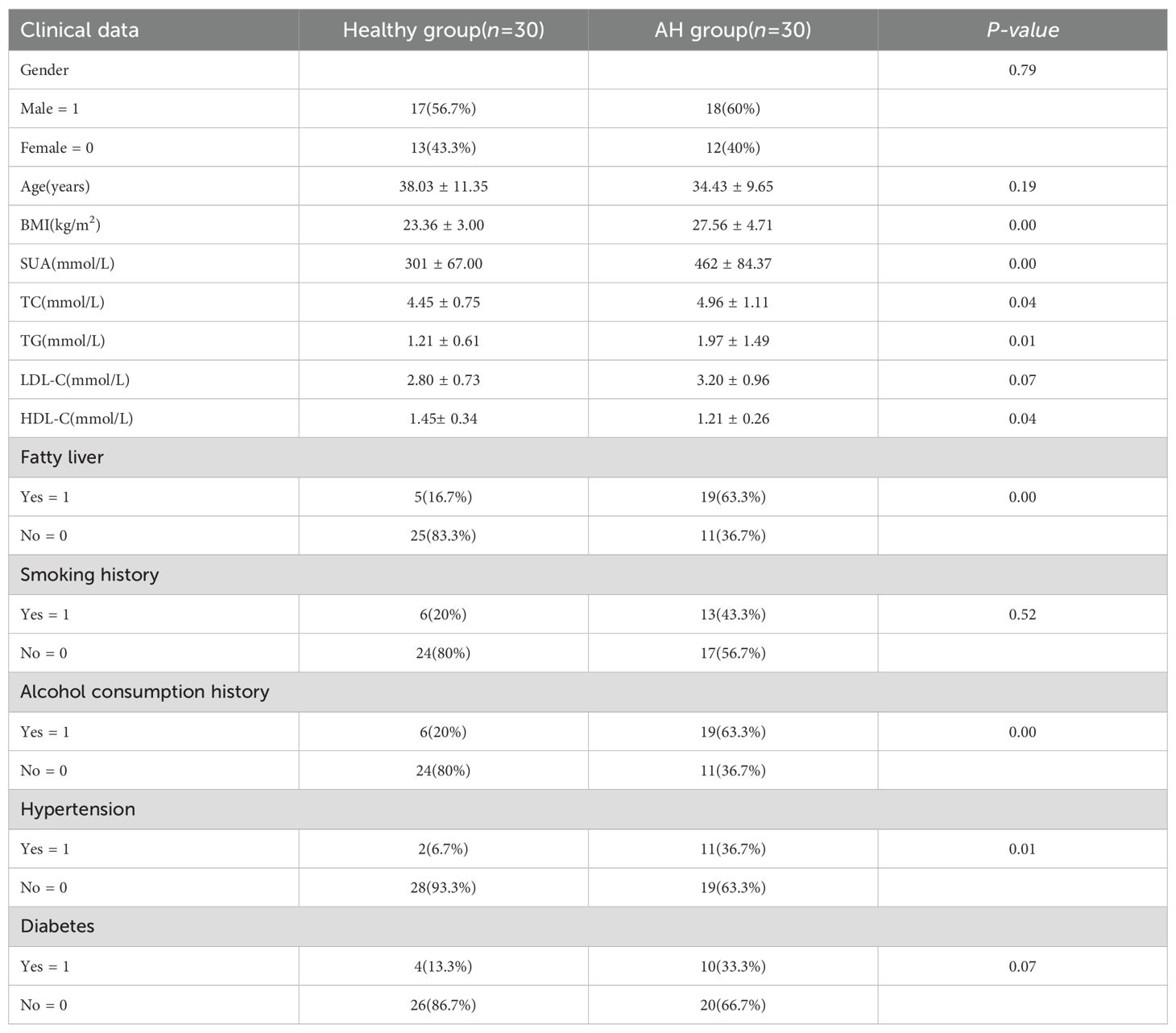 The AH group and the healthy control group showed no significant differences in age and gender (P > 0.05). The AH group exhibited significantly higher levels of BMI, Serum Uric Acid (SUA), TG, and TC compared to the healthy control group (P < 0.05), while High-Density Lipoprotein Cholesterol (HDLC) levels were significantly lower in the AH group (P < 0.05). Differences in hypertension, fatty liver, and alcohol history were statistically significant (P < 0.05) (Table 1).