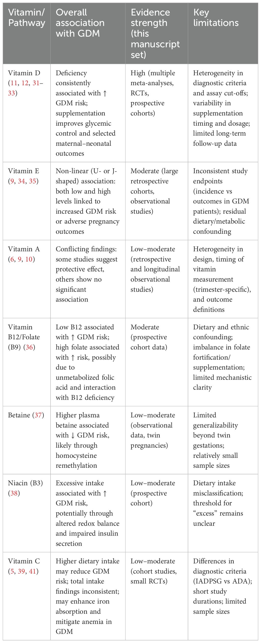 This review discusses how vitamin status influences risk of GDM. Deficiency and excess of certain vitamins can adversely affect glucose regulation in pregnancy, although findings often vary due to differences in study design and participants. Rather than reviewing each vitamin in sequence, it is valuable to think of them as part of a bigger picture that ties diet, metabolism, immunity, and oxidative stress together. A summary of the overall associations, evidence strength, and key limitations across vitamins is presented in Table 1.