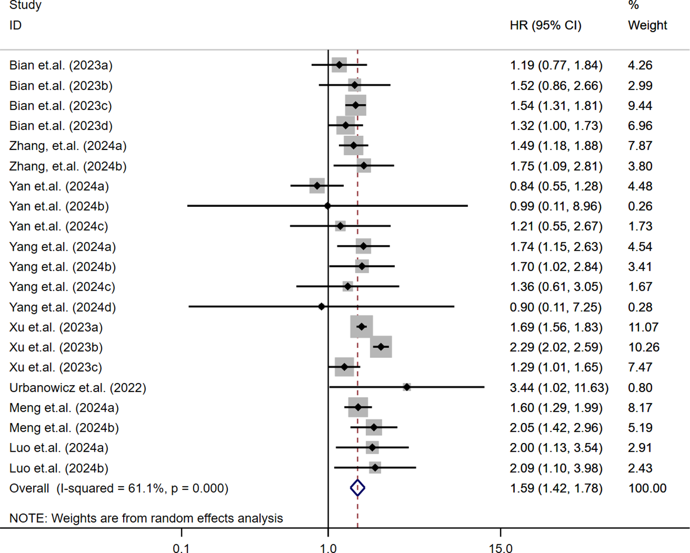A comprehensive search of PubMed, Embase, Cochrane Library, Web of Science, CNKI, VIP, Wanfang, and Biomedical Literature Database was conducted to identify eligible studies published up to October 26, 2024. Relative risk (RR), odds ratio (OR), and hazard ratio (HR), along with their 95% confidence intervals (CIs), were extracted and synthesized. Statistical analyses were performed using Stata 15.1 software.