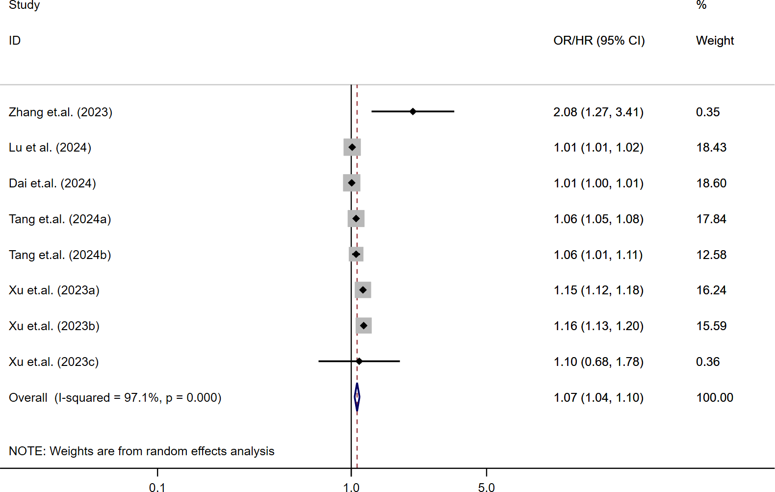 The relationship between continuous SII levels and MACE risk in diabetic patients was assessed across nine studies (23–25, 32, 35). Due to substantial heterogeneity (I² = 97.1%, τ² = 0.0012, P < 0.001), a random-effects model was used. The pooled analysis indicated that each 1-SD increase in SII was significantly associated with increased MACE risk (OR/HR = 1.07; 95% CI: 1.04-1.10; P < 0.001). These findings, shown in Figure 3, suggest a consistent positive association across studies despite variability in effect sizes.