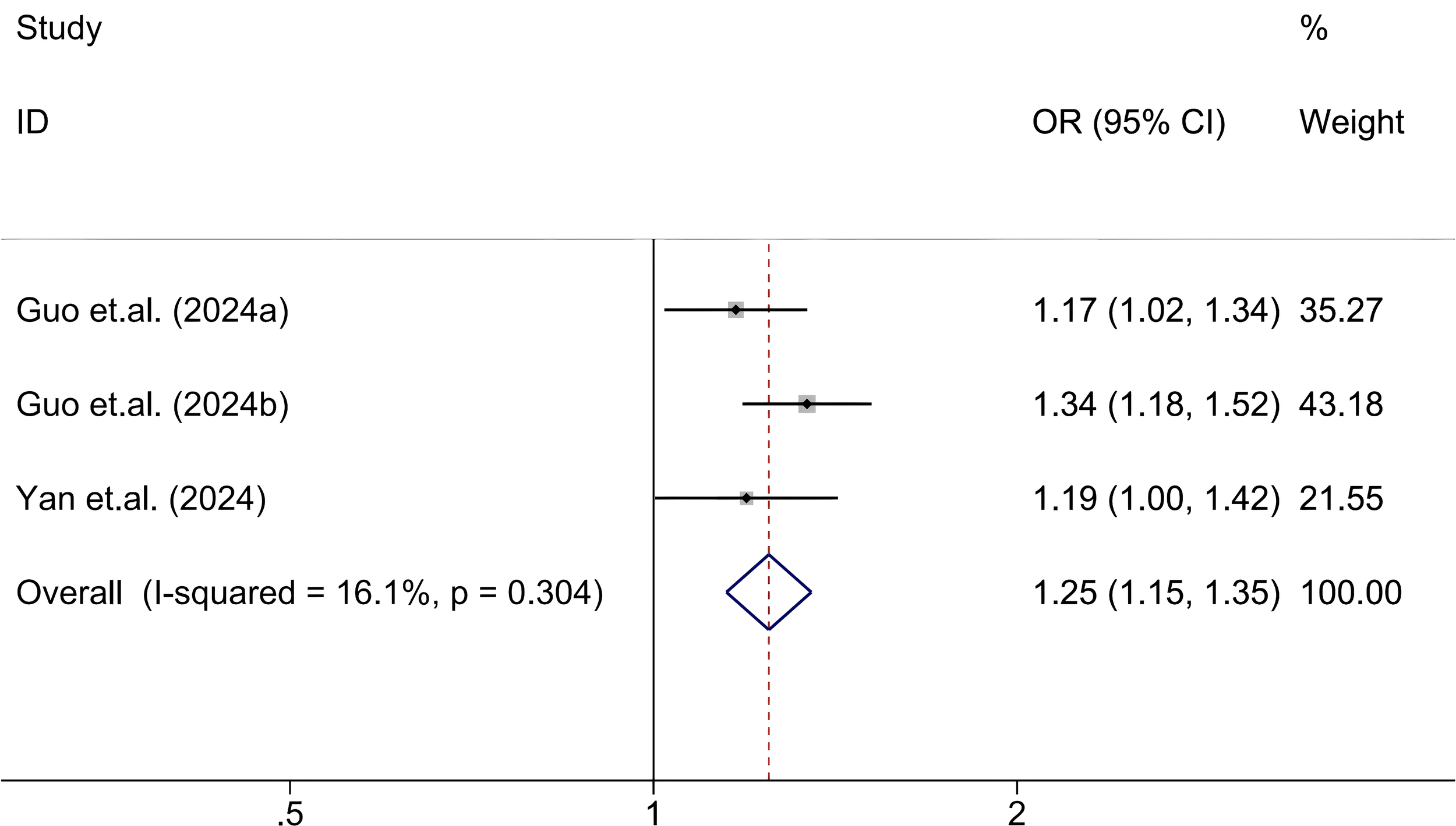 The association between SII and abnormal glucose metabolism was assessed based on three cohorts from two independent studies (29, 36). Given the low heterogeneity across studies (I² = 16.1%, P = 0.304), a fixed-effects model was used. The pooled results revealed that elevated SII levels were significantly associated with increased odds of abnormal glucose metabolism (OR = 1.25; 95% CI: 1.15-1.35; P < 0.001), indicating a consistent and directionally positive relationship across all included cohorts (Figure 5).