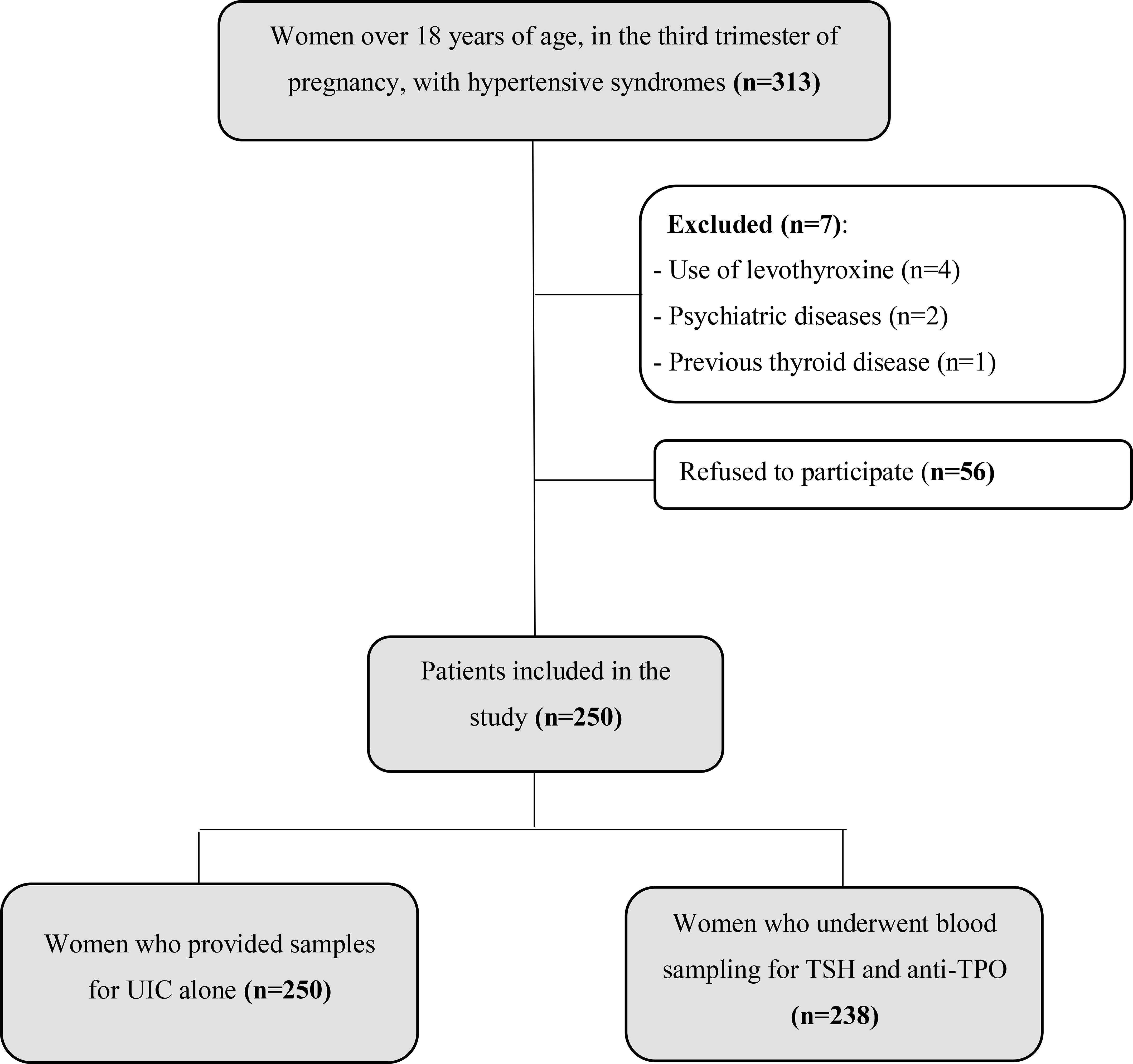A total of 313 pregnant women were screened. Seven were excluded due to previous thyroid disease, psychiatric conditions or use of levothyroxine. Another 56 women declined to participate, leaving 250 who provided urine samples for UIC analysis. Twelve of these women, however, refused to provide blood samples for TSH and anti-TPO analysis (Figure 1).