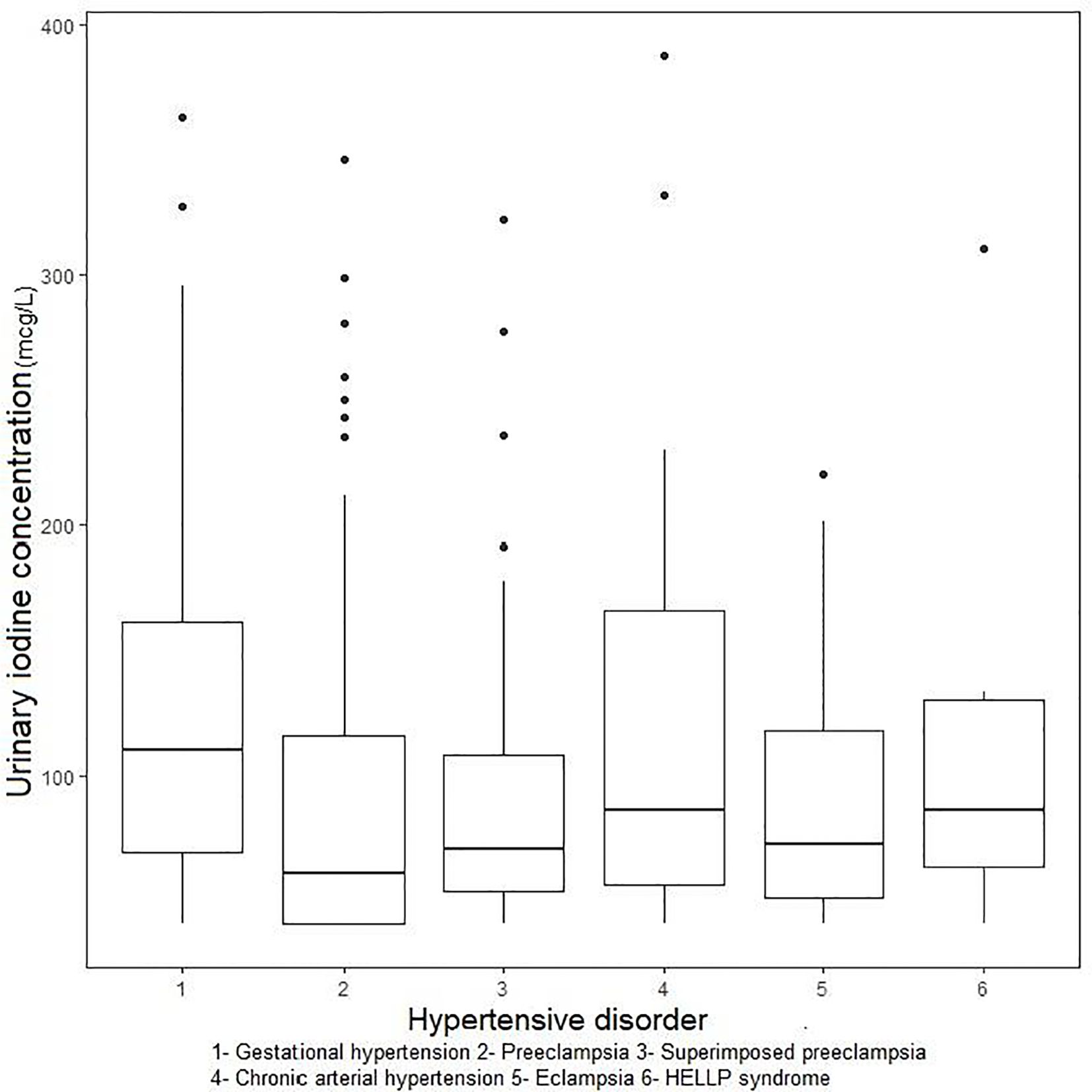 The overall median UIC was 82.5 μg/L (95%CI: 72.9-93.8 μg/L). The lowest median UIC was found in women with preeclampsia (61.3 μg/L; 95%CI: 49.2-84.5 μg/L) and superimposed preeclampsia (70.1 μg/L; 95%CI: 64.0-83.1 μg/L). A statistically significant difference in median UIC was observed across types of hypertensive disorders (p=0.023) (Table 2, Figure 2).