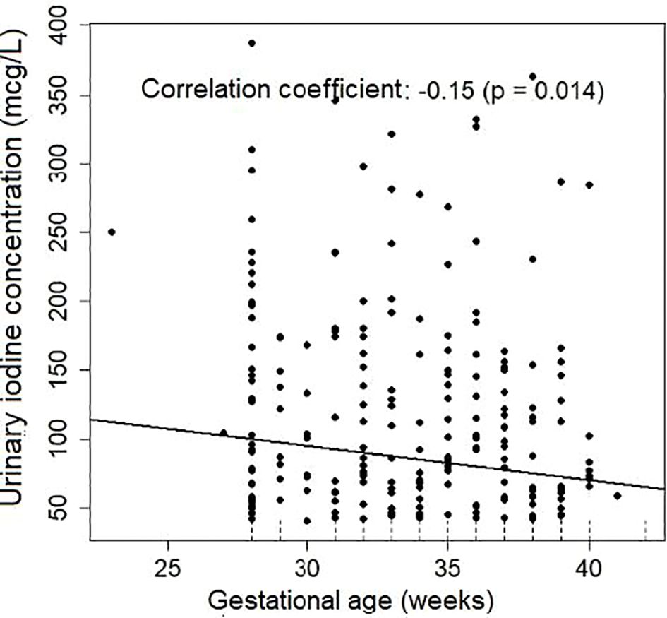 UIC is the most common marker for evaluating iodine status (48, 51); however, it is subject to significant intra-individual variation including urine dilution and recent dietary intake (49, 52). This study did not record data on dietary intake and, and the participants were hospitalized, which accounted for a change in their normal dietary pattern. Currently, there is an ongoing debate on the ideal index for evaluating individual iodine intake in pregnant women (49).