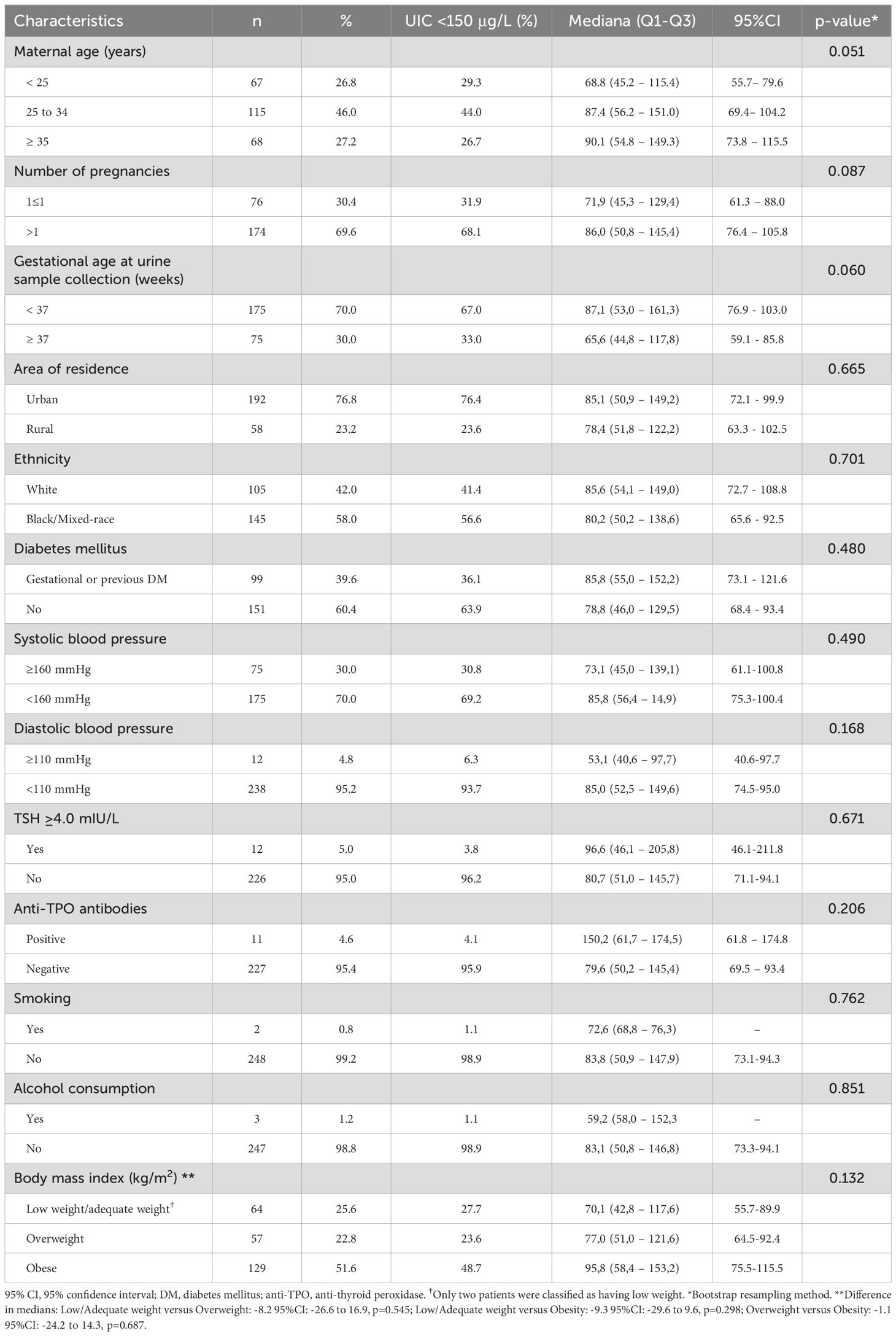 Of the 250 participants, 76.4% (n=191) had UIC <150 μg/L, with 14.0% (n=35) having UIC below the detection limit of 40.6 μg/L. Most women were 25–34 years of age (46%; n=115), had had ≥2 pregnancies (69.6%; n=174), self-identified as brown-skinned/black (58%; n=145), had a partner (81.6%; n=204), earned an income (52.2%; n=109), lived in an urban area (76.8%; n=192), resided in the Agreste region of Paraíba (85.2%; n=213), had high school or university education (51.3%; n=121), were obese (51.6%, n=129), did not have DM (60.4%; n=151) and did not smoke (99.2%; n=248) or drink alcohol (98.8%; n=247). No illicit drug use was reported (Table 1).