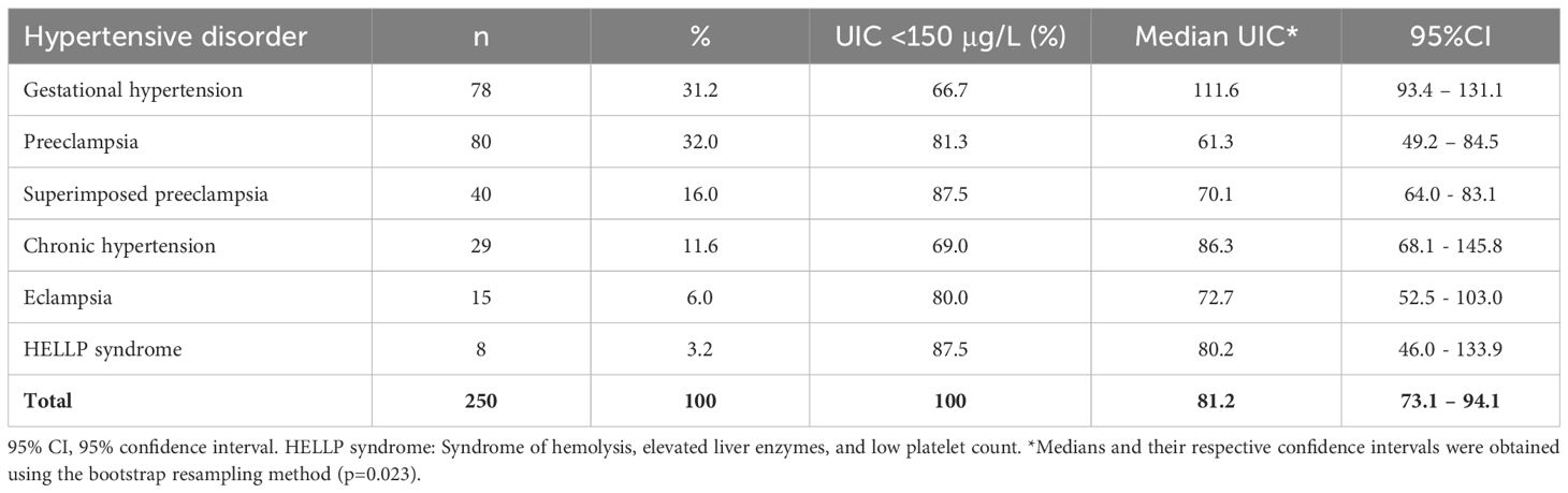 Results: The median UIC was 82.5 μg/L (95%CI: 72.9–93.8), with 76.4% of participants (n=191) being iodine deficient. UIC differed among hypertensive disorders (p=0.023), with significant differences found between gestational hypertension (111.6 μg/L) and both preeclampsia (61.3 μg/L; p=0.018) and superimposed preeclampsia (70 μg/L; p=0.020). Systolic blood pressure (SBP) and gestational age correlated negatively with UIC (-0.006±0.002, p=0.015; -0.03±0.01, p=0.042, respectively). No correlation was found between UIC and TSH levels or anti-TPO antibodies.