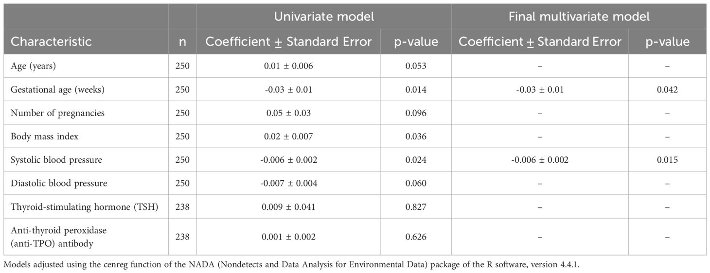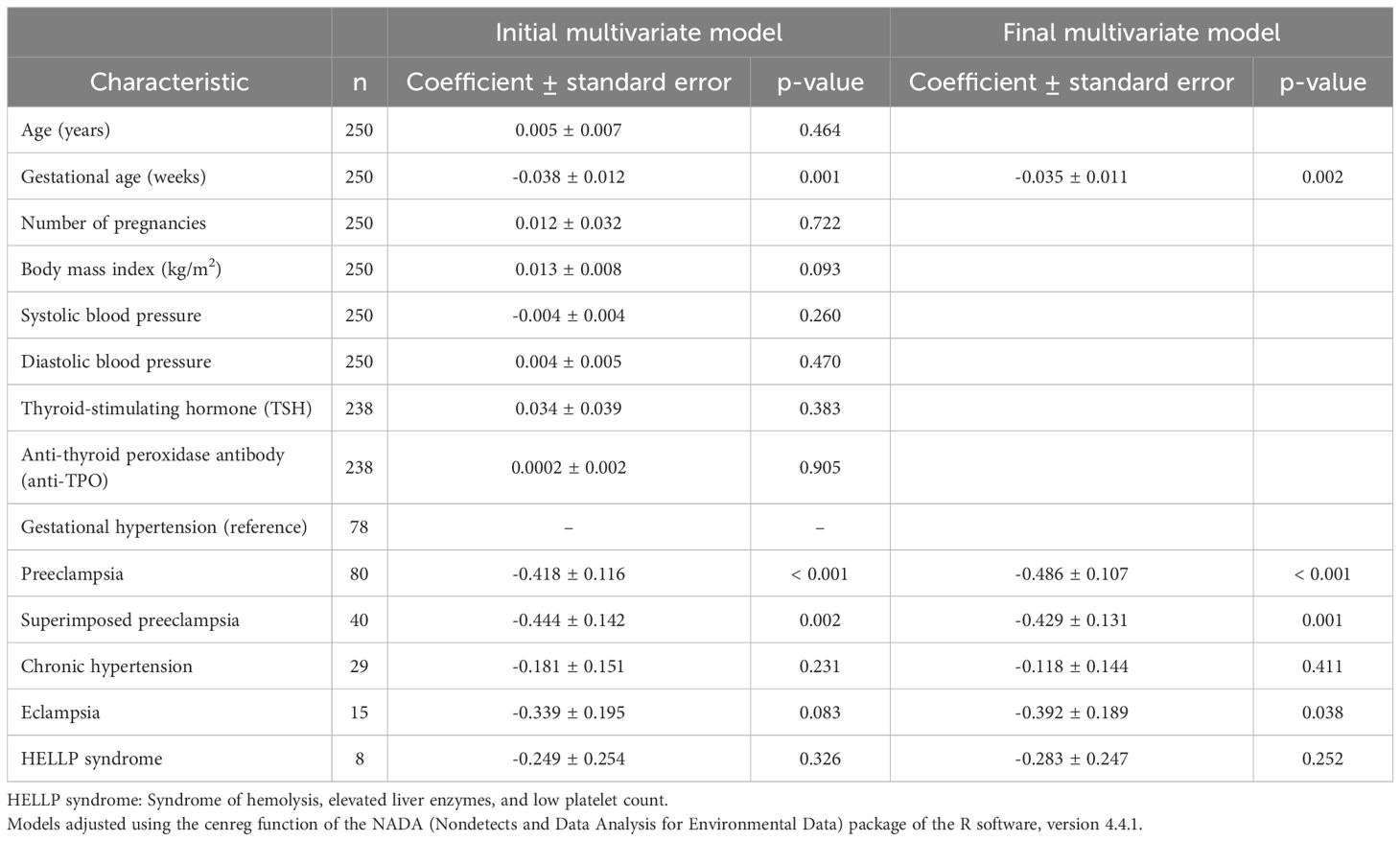 Methods: This cross-sectional study was conducted in a referral maternity hospital in Paraíba, Brazil between June 2022 and April 2023. A total of 250 women over 18 years of age, in the third trimester of pregnancy and diagnosed with hypertensive disorders were included. Clinical and epidemiological data, as well as TSH, anti-TPO antibodies and UIC were assessed. Iodine deficiency was defined as UIC levels <150 μg/L. Correlations between UIC and the study variables were analyzed using regression models adjusted with the cenreg function of the Nondetects and Data Analysis for Environmental Data (NADA) statistical package.
