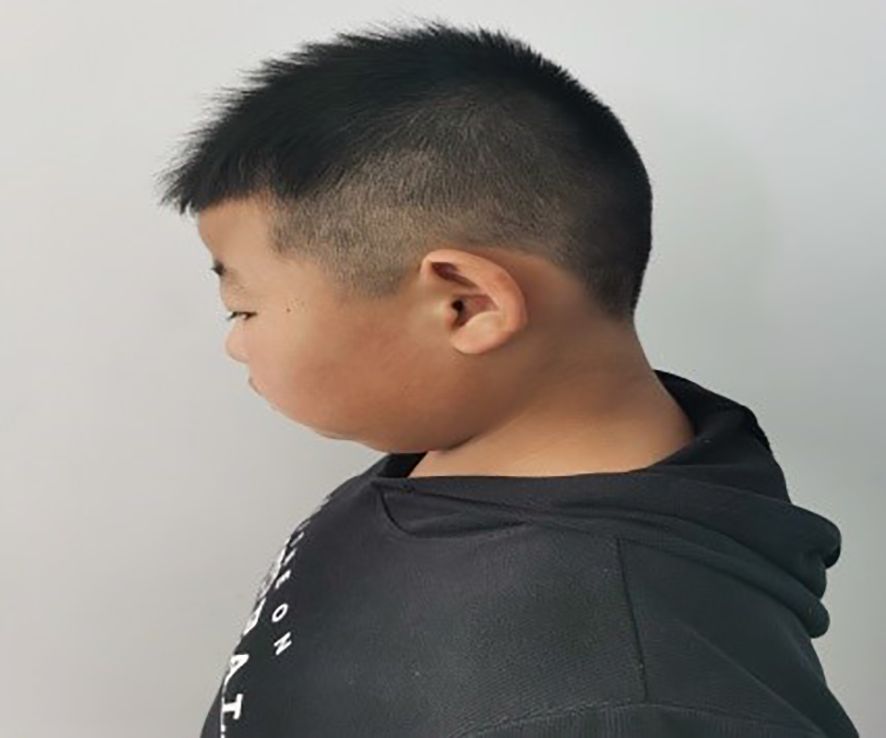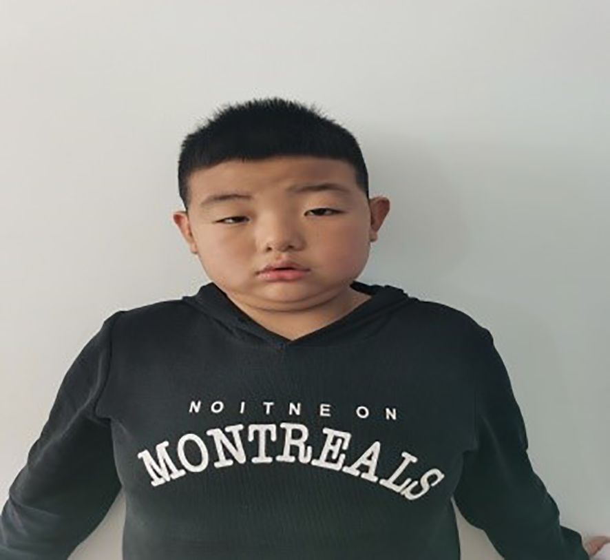 The patient, a 9-year-old male, was brought to our endocrinology clinic in June 2021 due to a history of congenital hypothyroidism (CH) and intellectual disability. He was born to a G2P2 mother via cesarean section at 38 weeks and 5 days, with a birth weight of 3,150 g and a birth length of 50 cm. His mother underwent routine prenatal checkups during pregnancy, with no significant abnormalities detected. Postnatal feeding was normal. At 2 months of age, he was diagnosed with CH based on abnormal heel-prick blood test results and received oral treatment: LT4:4.4μg/kg/d, taken in the morning and checked regularly for five thyroid functions. Currently, LT4: dose is 1.5μg/kg/d, taken in the morning. The child learned to walk and have simple conversations at the age of 1 year and 3 months. At the age of 3, the child showed intellectual disability, poor comprehension, poor expression ability, and poor learning. However, the child’s height increased normally every year and their weight increased by 10kg per year. Physical examination on admission showed that his weight was 50 kg (>95th percentile), height was 138.5 cm (50th percentile), and his BMI was 26.2 kg/m² (>95th percentile). The child has an obese body shape and can see special facial features, including small forehead, wide eye distance, small bilateral eye slits, low nose bridge, protruding nose, short stature, small chin, large ears, short neck, etc (Figures 1–3). No abnormalities were found in the muscle strength and tension of the child’s limbs. The boy’s external genitalia showed no abnormalities.