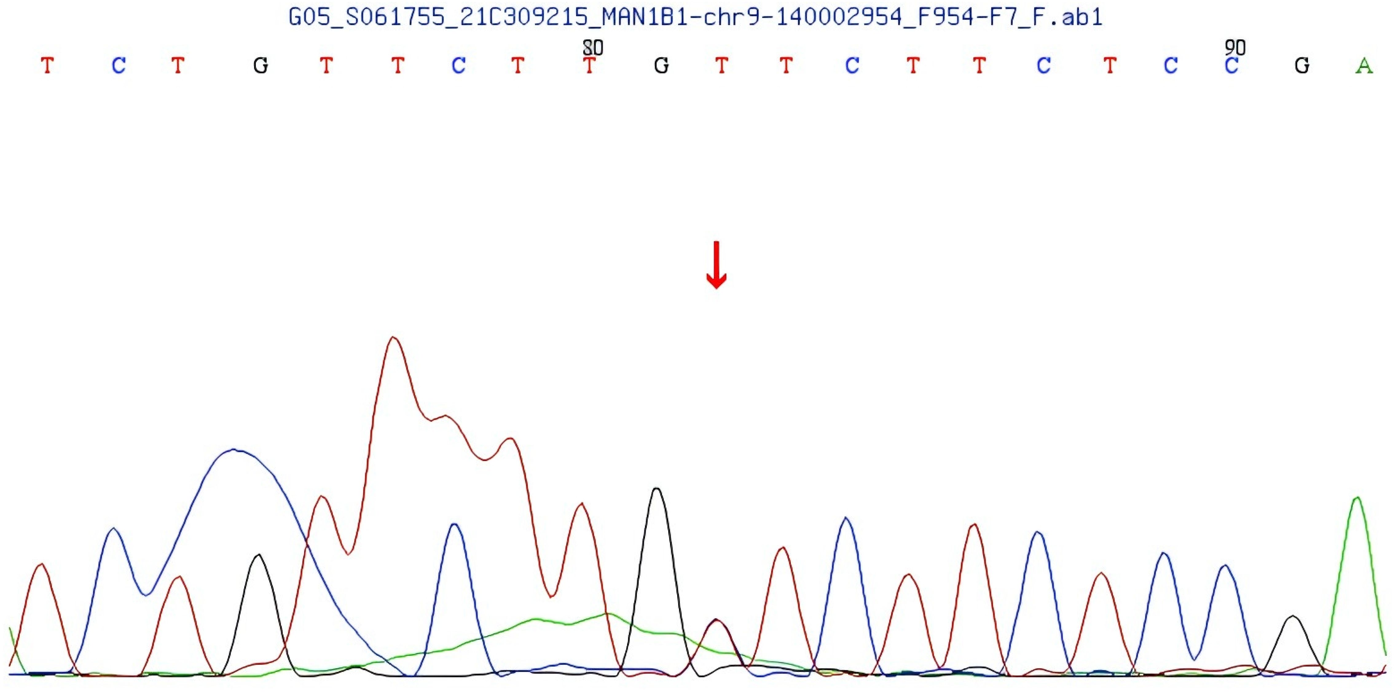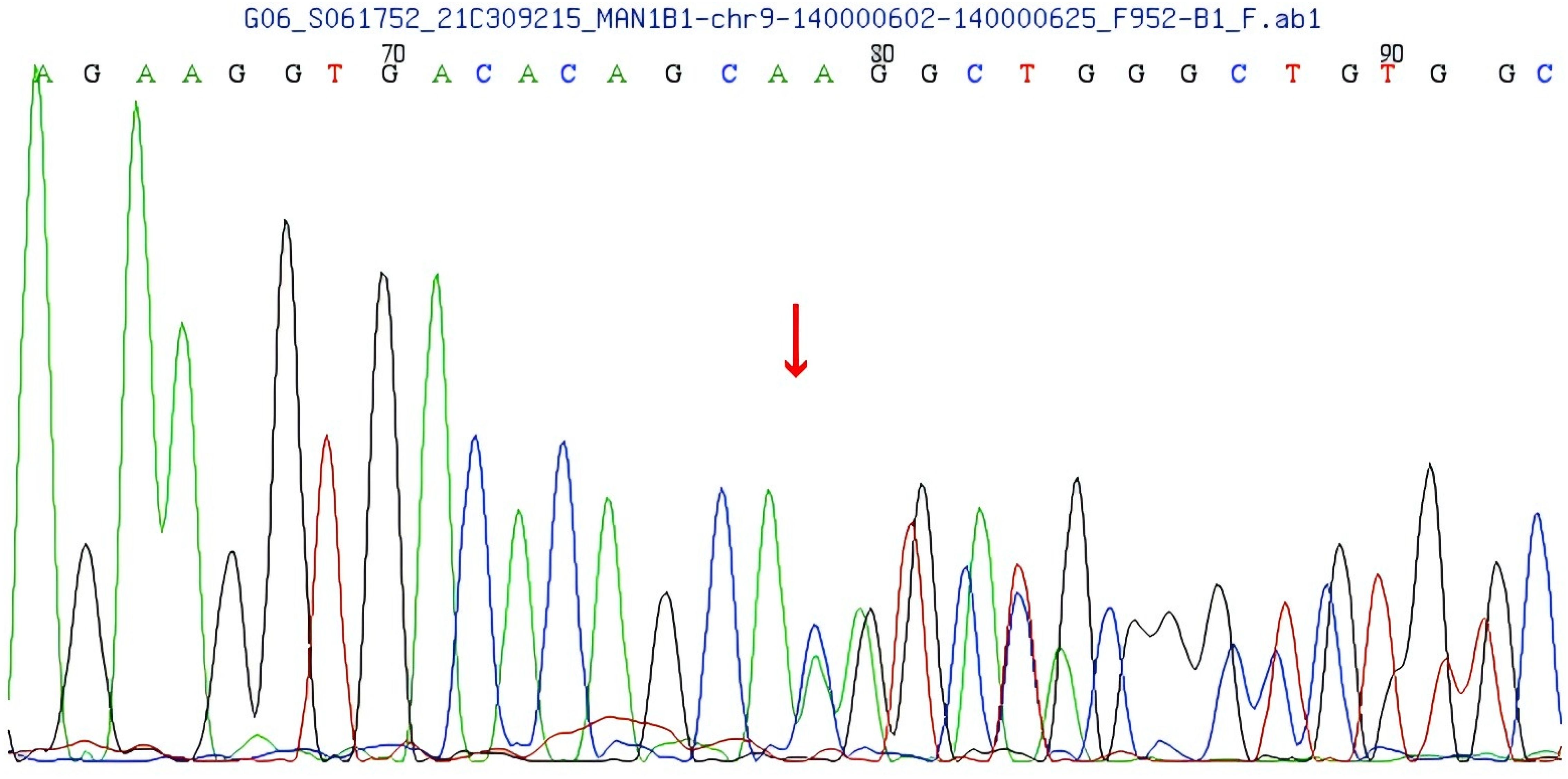 The MAN1B1 gene (OMIM 604346) is located on chromosome 9q34.3 and consists of 13 coding exons. It is a protein-coding gene that encodes an enzyme belonging to the glycosyl hydrolase family 47, which plays a role in N-glycan biosynthesis. In 2013, MAN1B1 was identified as the first Golgi α-mannosidase associated with human diseases, with this class of enzymes being involved in N-glycan remodeling (9, 10). MAN1B1-CDG is a relatively common subtype of CDG-II, with an autosomal recessive inheritance pattern. Currently, there are no statistical reports on mutation frequency, but over 40 different types of mutations have been reported. In this study, compound heterozygous mutations were identified in the MAN1B1 gene of the patient: c.1281_1303delCATCCACGGCCTGTCTGGGAAGA and c.2011C>T. Table 3 presents the results of the genetic analysis. Currently, it is unclear whether there is a pattern to follow. The mutations seem to be random, and it is impossible to determine which mutation dominates. However, frameshift mutations were only mentioned once in 2014, and may be even rarer.