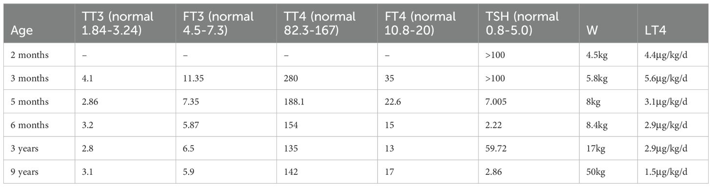 Diagnostic testing revealed that the thyroid function panel (five parameters) conducted at 3 months of age showed total triiodothyronine (TT3):4.1 nmol/L (normal: 1.84-3.24 nmol/L), free triiodothyronine (FT3):11.35 pmol/L (normal: 4.5-7.3 pmol/L), total thyroxine (TT4):280nmol/L (normal:82.3-167.0 nmol/L), free thyroxine (FT4): 35 pmol/L (normal:10.8–20 pmol/L), and thyroid-stimulating hormone (TSH): >100 mIU/L (normal:0.8-5.0 mIU/L). The FT3 and FT4 values of the patient are higher than the normal range, which is considered to be related to the supplementation of LT4. However, the TSH of the patient is still significantly higher than normal, so the LT4 dose is adjusted to 33ug/time and taken in the morning for treatment. The panel repeated at 5 months of age showed TT3:2.86 nmol/L (normal: 1.84-3.24nmol/L), FT3:7.35 pmol/L (normal: 4.5-7.3 pmol/L), TT4:188.1 nmol/L (normal: 82.3-167.0 nmol/L), FT4 of 22.6 pmol/L (normal: 10.8–20 pmol/L), and TSH of 7.005 mIU/L (normal: 0.8-5.0 mIU/L). At 9 years of age, the thyroid function panel demonstrated values within the reference range (See Table 1 for details).