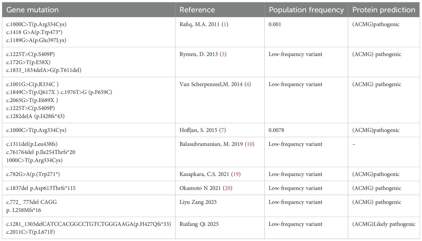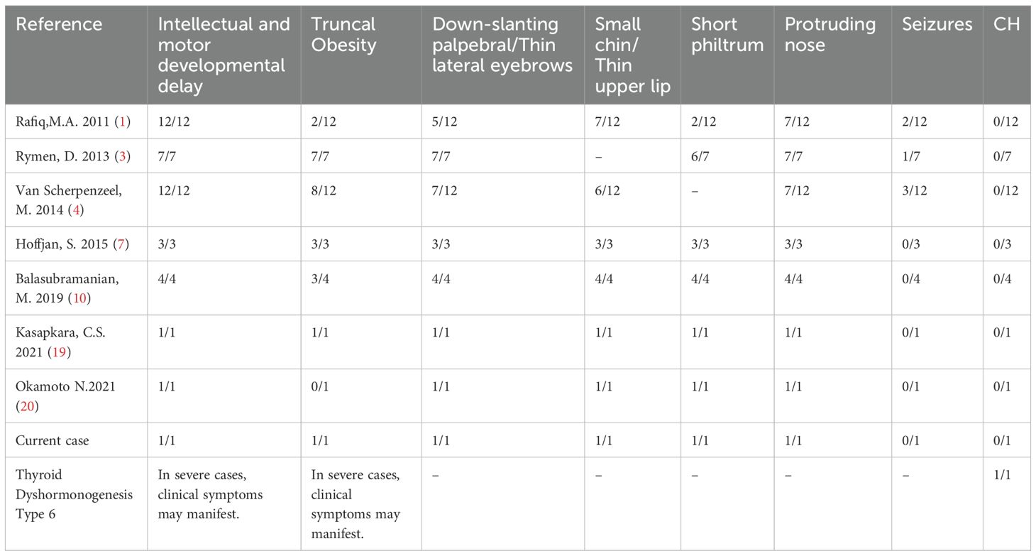 In 2013, Rymen et al. from Belgium reported 7 patients carrying MAN1B1 gene mutations and classified these cases as congenital glycosylation type II disorder (CDG-II), suggesting that MAN1B1 gene mutations may be a potential pathogenic factor (2, 3). In 2014, Scherpenzeel et al. conducted a study on 100 CDG-II children and identified 11 patients carrying MAN1B1 gene mutations. Two of the patients also showed mild coagulation abnormalities, which is considered a newly discovered clinical feature (3, 5). In 2015, Hoffjan found the mutation of MAN1B1 gene in a close relative family in Türkiye, and all three patients carried c.1000C>T (p.Arg334Cys) mutation (6, 7). Rafiq et al. reported this mutation in 2011. In 2025, Zang et al. reported a consanguineous Pakistani family with multiple affected individuals exhibiting mild dysmorphic facial features, developmental delay, and intellectual disability. Whole-exome sequencing led to the identification of a novel MAN1B1 variant (c.772_775del) (8). Our proband has unique facial features (small forehead, wide eye distance, small bilateral eye slits, low nasal bridge, protruding nose, short stature, small chin, large ears, short neck), delayed critical intelligence, trunk obesity, abnormal coagulation function, abnormal electroencephalogram, etc., which are similar to the clinical manifestations of CDG-II caused by MAN1B1 deficiency reported in the literature. Table 2 summarizes the clinical symptoms of patients and the characteristics associated with Rafiq syndrome. In addition, the proband also had thyroid secretion disorder type 6, which has not been found in other studies.