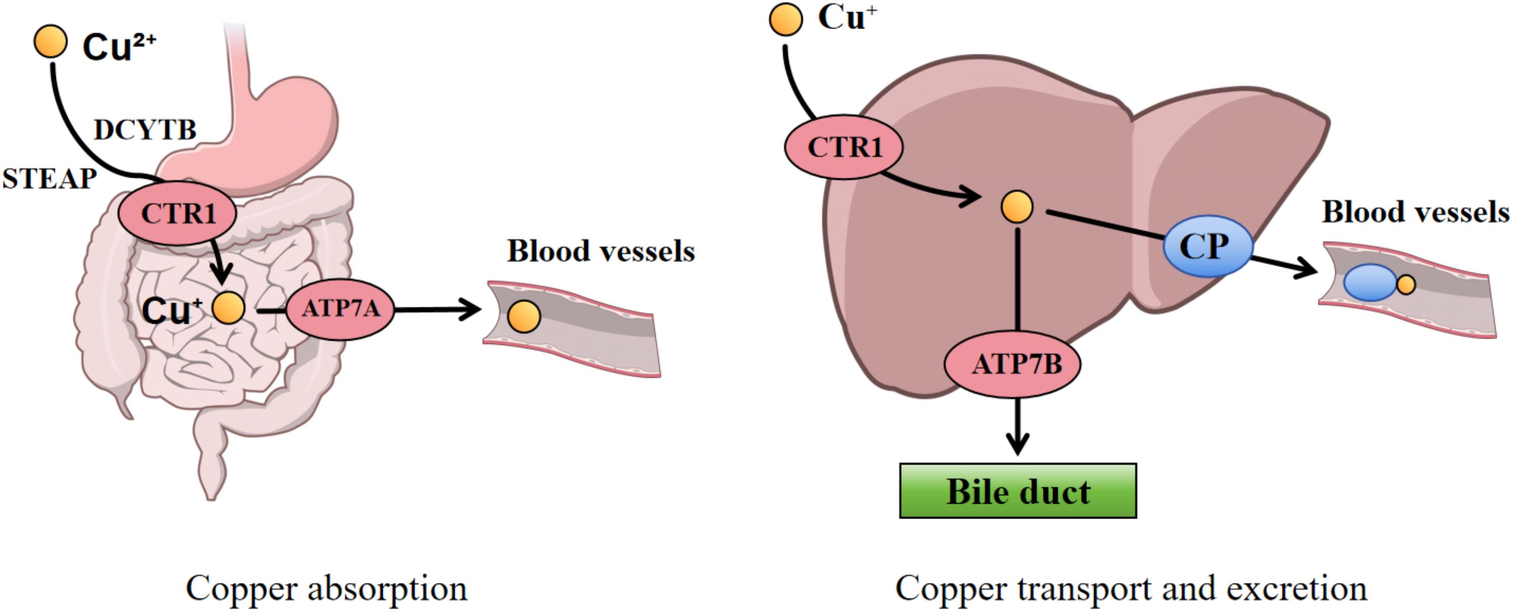 The absorption of dietary copper, which exists primarily in the Cu²+ form, occurs mainly in the duodenum, with the stomach and distal ileum also contributing to a lesser extent (12). Prior to absorption by enterocytes, Cu²+ must be reduced to Cu+. This reduction is facilitated by key proteins such as the six-transmembrane epithelial antigen of the prostate (STEAP) and duodenal cytochrome B (DCYTB). Subsequently, Cu+ is taken up into the enterocytes through the high-affinity copper transporter 1 (CTR1, encoded by the SLC31A1 gene), located on the apical membrane (13).