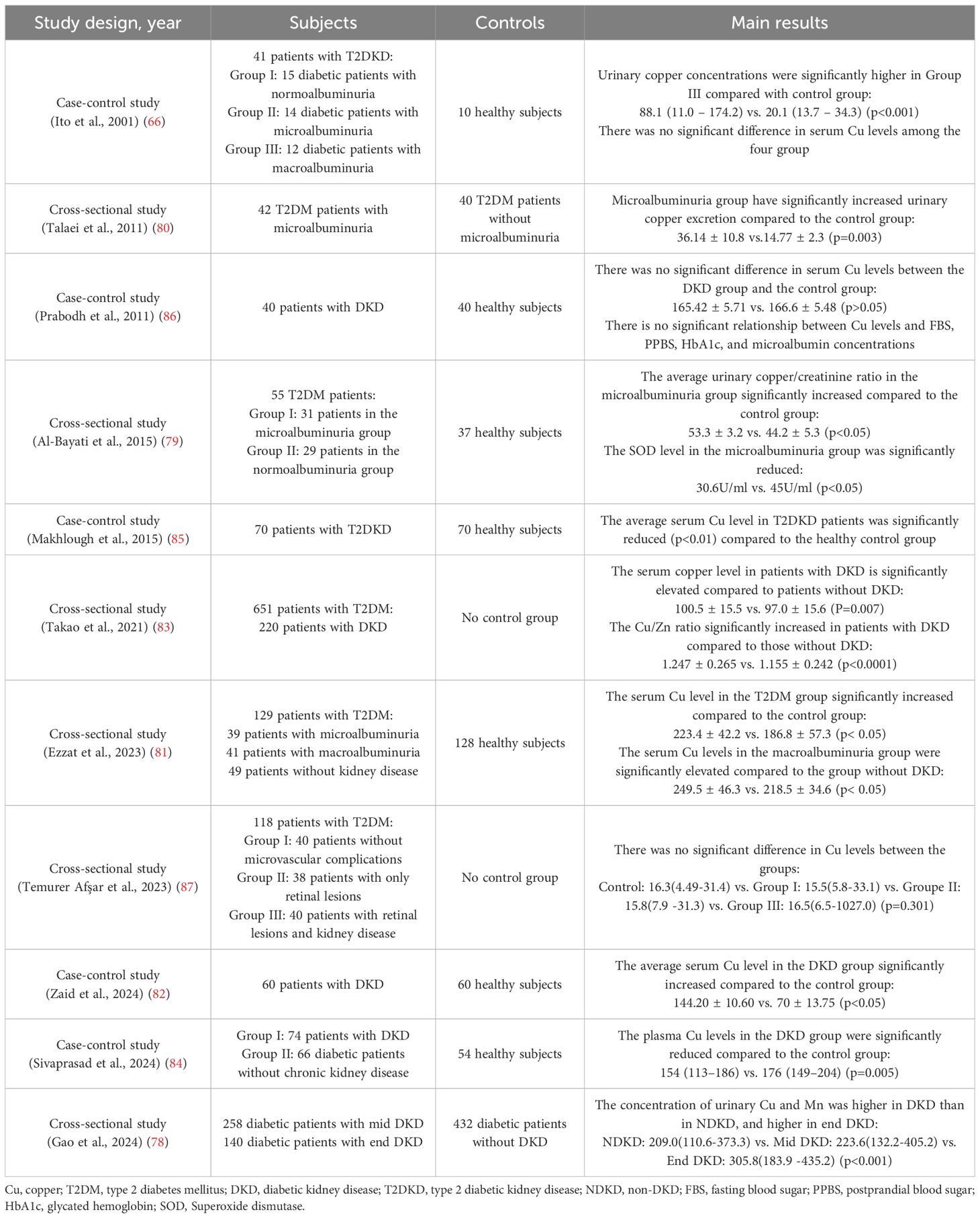 In general, the inconsistency of current research results on copper, diabetes and DKD shows that the role of copper in the development of diabetes may be more complex than expected, and more research is needed to reveal its potential mechanism and provide scientific basis for clinical intervention.