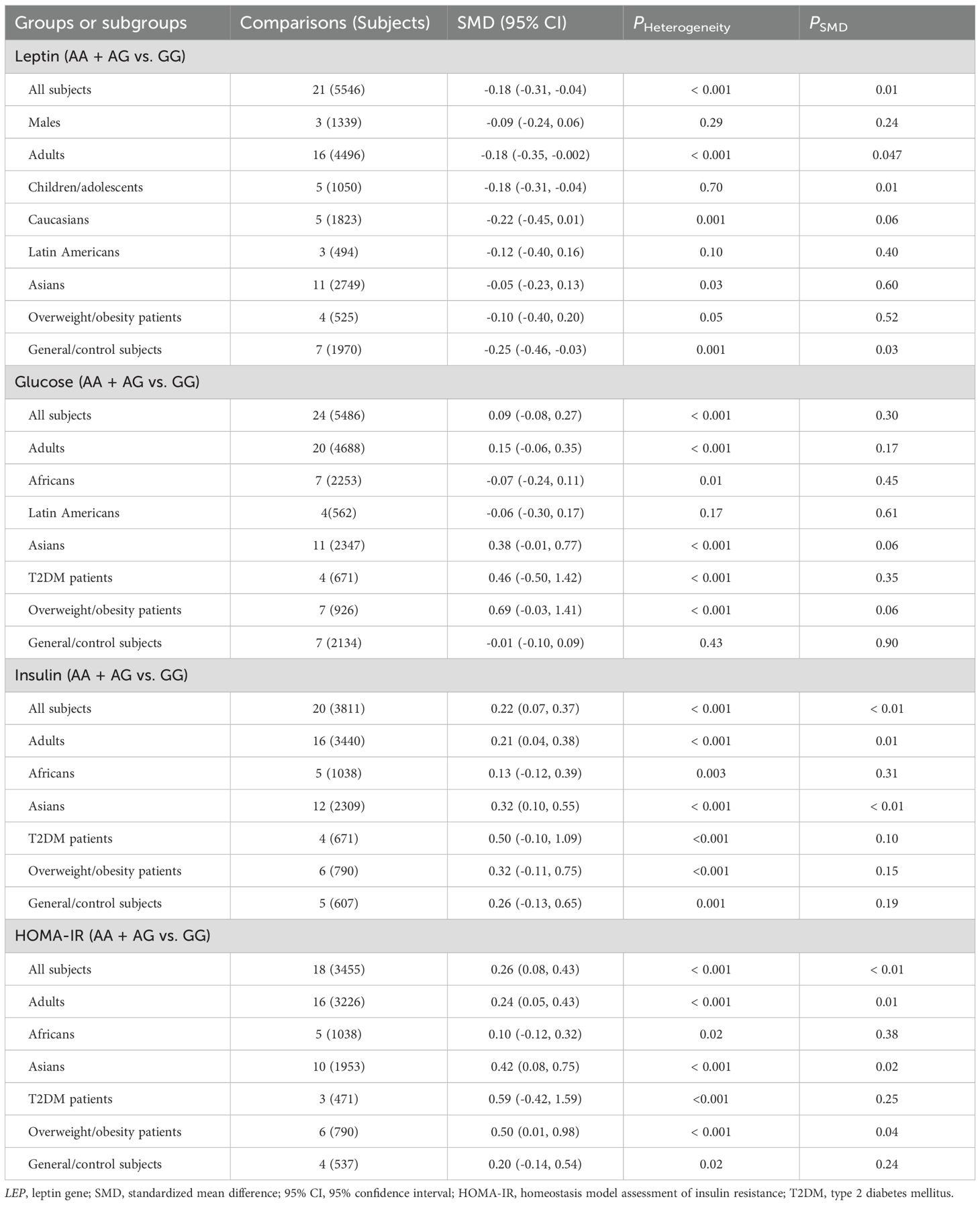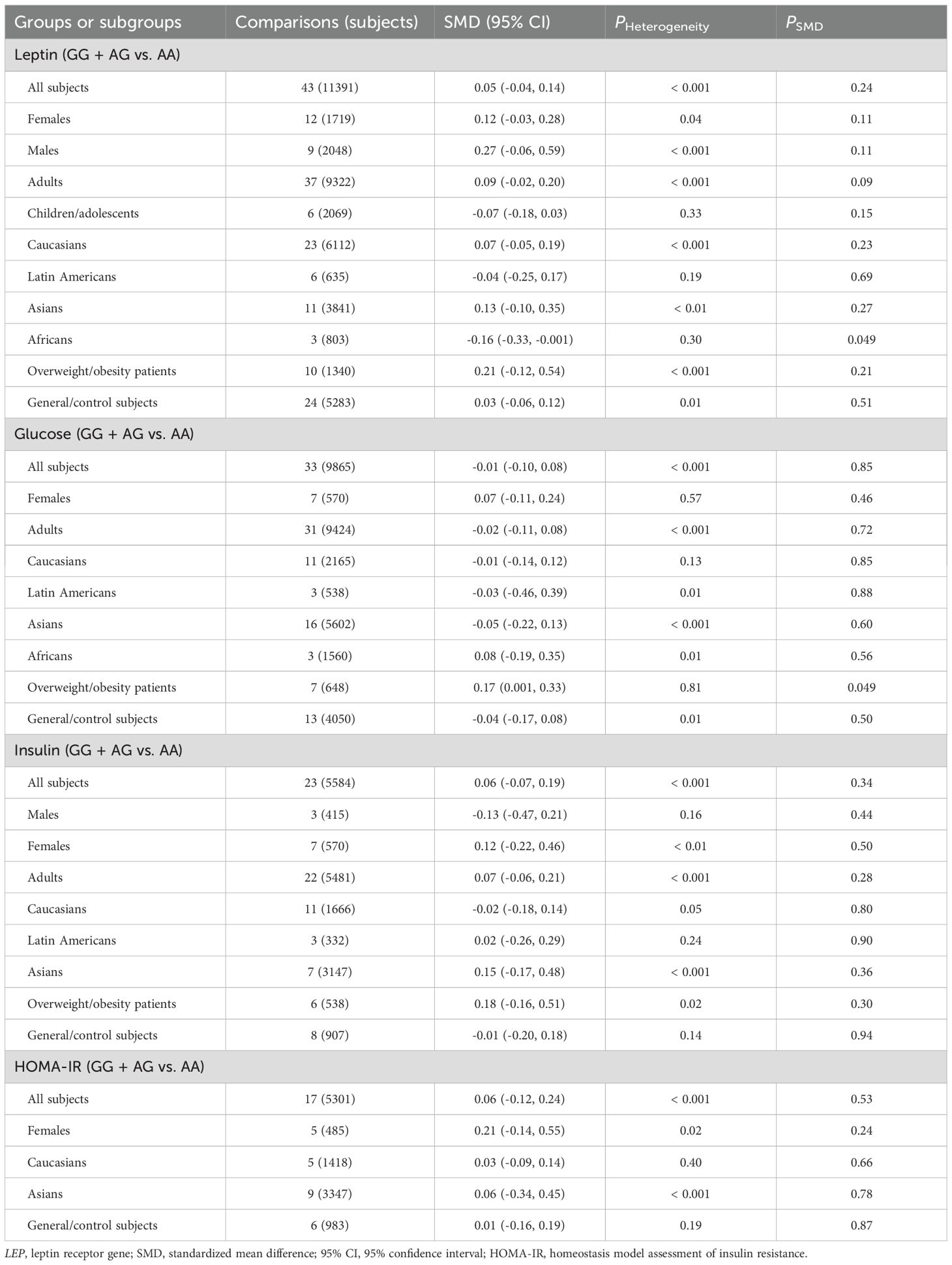 Conclusions: The meta-analysis suggests that the A allele of LEP rs7799039 variant is associated with an increased risk of insulin resistance, potentially through its effect on reducing leptin levels. LEPR rs1137101 and rs1805094 variants show weak associations with leptin levels and glucose-lipid metabolism markers.