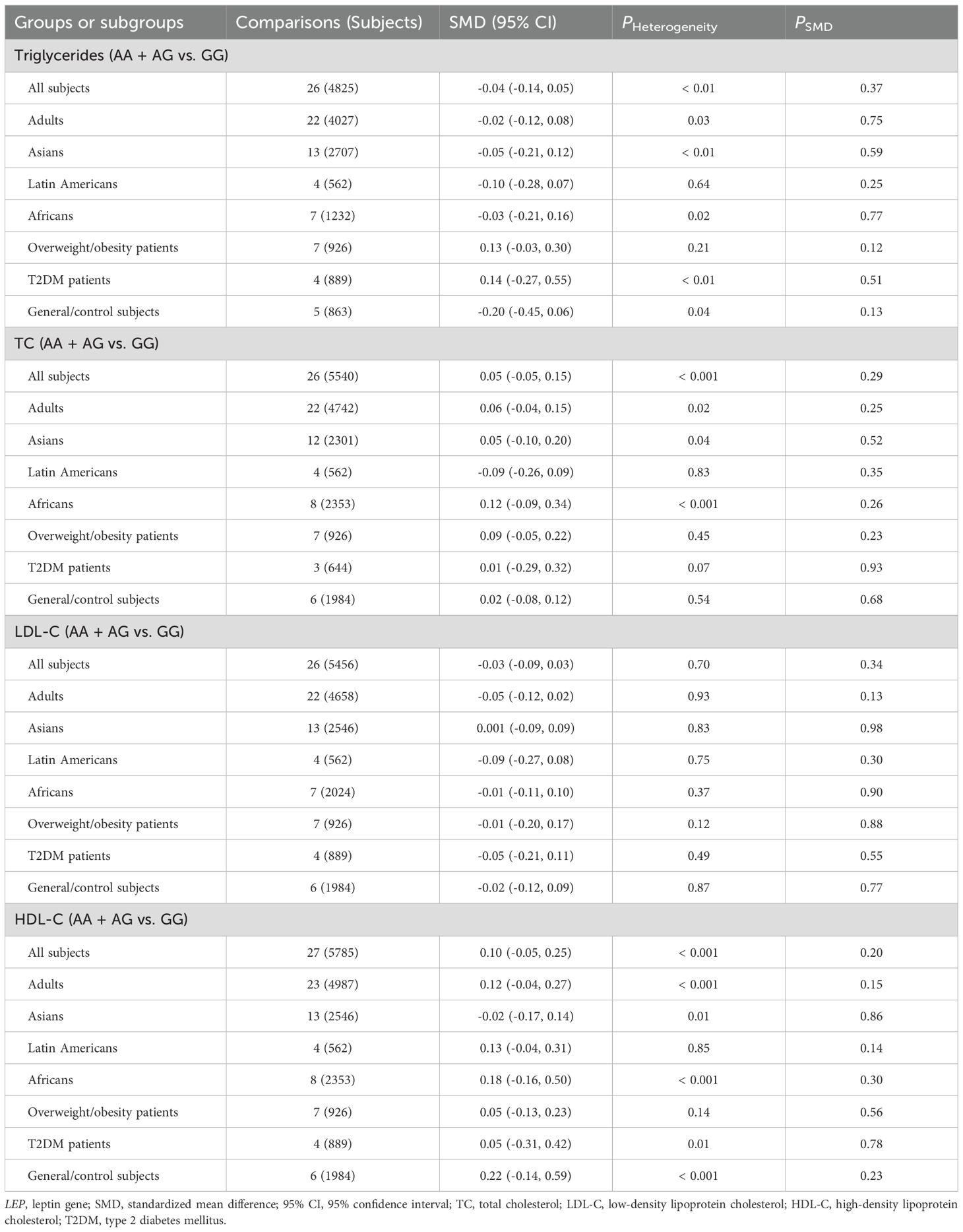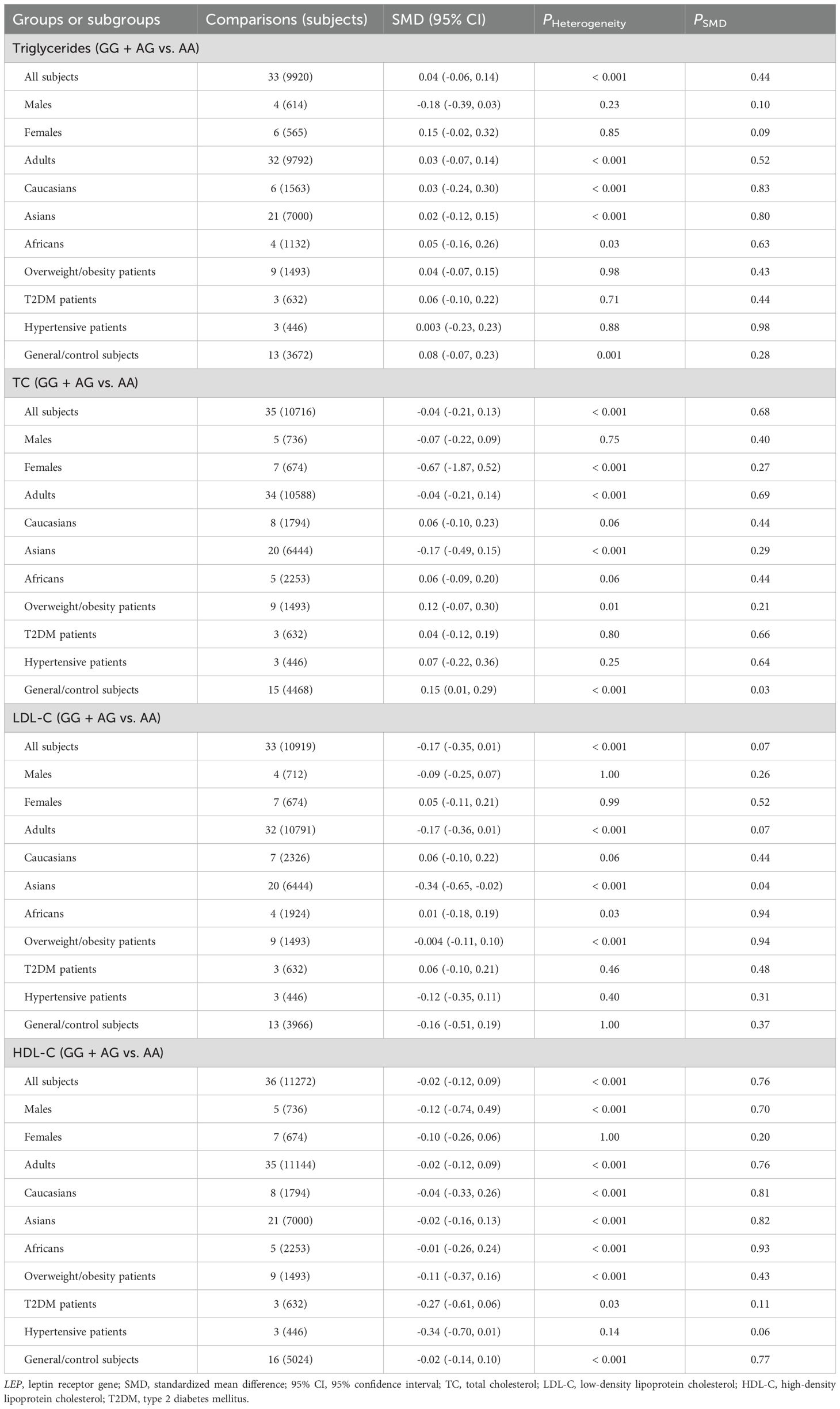 No significant associations were found between LEPR rs1137100 (Supplementary Tables S14, S15; Supplementary Figures S6-S13), rs1137101 (Tables 3, 4; Supplementary Figures S14-S21), and rs1805094 (Supplementary Tables S16, S17; Supplementary Figures S22-S29) variants and leptin levels or any markers of glucose-lipid metabolism across the entire population. However, subgroup analyses revealed significant associations between the G allele of the rs1137101 variant and lower leptin levels (SMD = -0.16 ng/mL, 95% CI = -0.33 to -0.001 ng/mL, p = 0.049) in Africans, as well as higher glucose levels (SMD = 0.17 mg/dL, 95% CI = 0.001 to 0.33 mg/dL, p = 0.049) in individuals with overweight/obesity (Table 3). Carriers of the G allele of rs1137101 also exhibited higher TC levels (SMD = 0.15 mg/dL, 95% CI = 0.01 to 0.29 mg/dL, p = 0.03) in the general/control subjects, but lower LDL-C levels (SMD = -0.34 mg/dL, 95% CI = -0.65 to -0.02 mg/dL, p = 0.04) in Asians compared to those with the AA genotype (Table 4). Furthermore, C-allele carriers of the rs1805094 variant showed elevated leptin levels in males (SMD = 0.29 ng/mL, 95% CI = 0.07 to 0.51 ng/mL, p < 0.01), children/adolescents (SMD = 0.17 ng/mL, 95% CI = 0.06 to 0.28 ng/mL, p < 0.01), and Caucasians (SMD = 0.20 ng/mL, 95% CI = 0.06 to 0.33 ng/mL, p < 0.01) than the GG homozygotes (Supplementary Table S16). Somehow, they had lower leptin levels than the GG homozygotes in Asians (Supplementary Table S16). C-allele carriers of the rs1805094 variant also had lower triglyceride levels (SMD = -0.17 mg/dL, 95% CI = -0.31 to -0.03 mg/dL, p = 0.02) in overweight/obesity patients, lower LDL-C levels in Asians (SMD = -0.43 mg/dL, 95% CI = -0.81 to -0.06 mg/dL, p = 0.03), and lower HDL-C levels in males (SMD = -0.33 mg/dL, 95% CI = -0.56 to -0.09 mg/dL, p < 0.01) and in Caucasians (SMD = -0.14 mg/dL, 95% CI = -0.28 to -0.01 mg/dL, p = 0.04) compared to those with the GG genotype (Supplementary Tables S16, S17). No significant relationships were observed between the rs1137100 variant and leptin or glucose-lipid metabolism markers in both the overall and subgroup analyses (Supplementary Tables S14, S15).