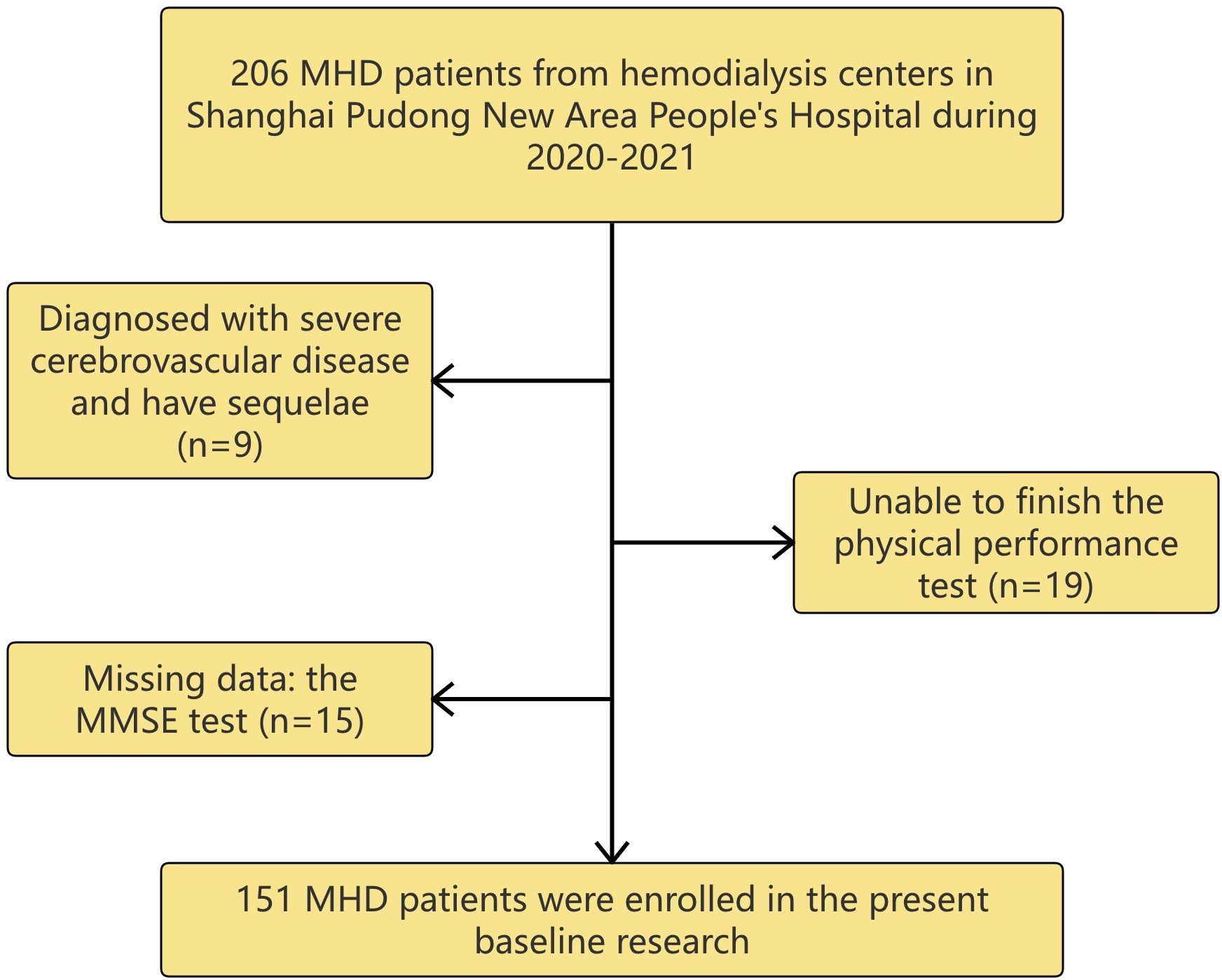 This cross-sectional study enrolled patients who underwent MHD at the blood purification center in Shanghai Pudong New Area People’s Hospital between July 2020 and April 2021. Patients aged 18 years or older who were receiving hemodialysis for 4 hours per session, three times a week, and for more than 3 months were included in the study. Participants with the following conditions were excluded: (1) were diagnosed with severe cerebrovascular disease and had sequelae; (2) were unable to finish the physical performance test; and (3) did not complete the MMSE test (Figure 1). All the investigations were conducted in accordance with the Declaration of Helsinki, and the study was approved by the Ethics Committee of Shanghai Pudong New Area People’s Hospital (PRYLW2018-01). All of the participants in this study provided written informed consent. All the details and privacy of the patients have been deidentified.