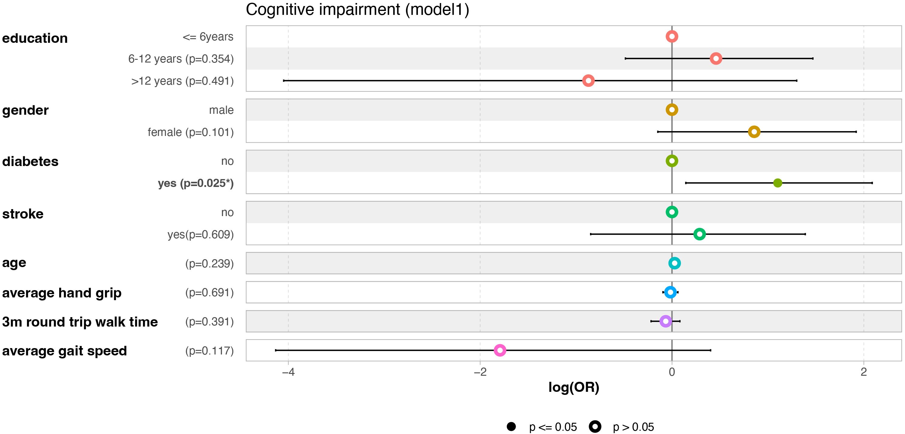Afterwards, 8 variables, namely, age, sex, stroke status, HS, TUGT results, GS, diabetes status, and education level, were chosen to develop a multivariate logistic regression model (Model 1).