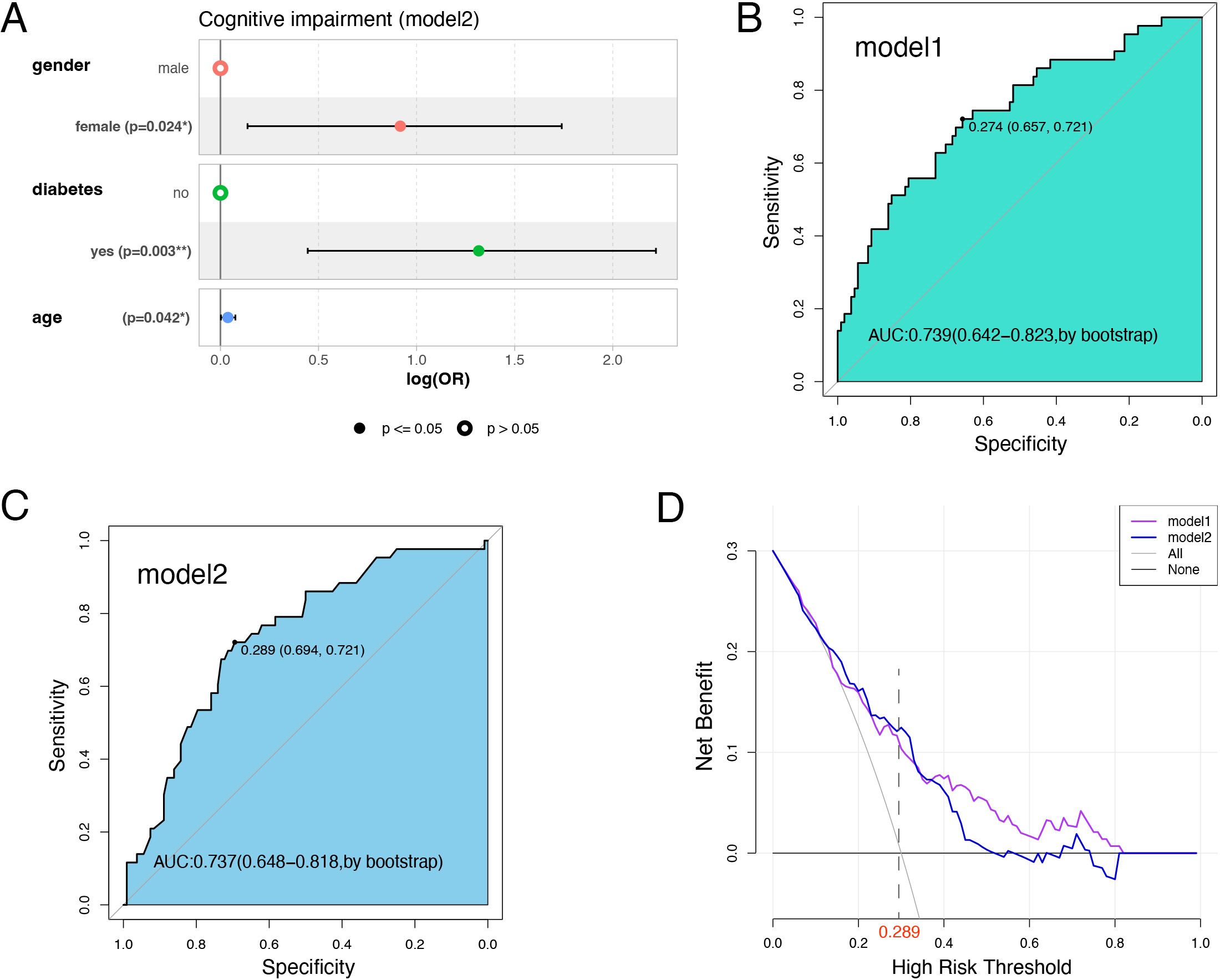 Figure 3. The forest plot of model 2 and comparisons between model1 and model2. (A) The forest plot of model1, including 3 variables. (B) The ROC curve of model1 and cut-off point. (C) The ROC curve of model2 and cut-off point. (D) The DCA curve of model1 and model2.