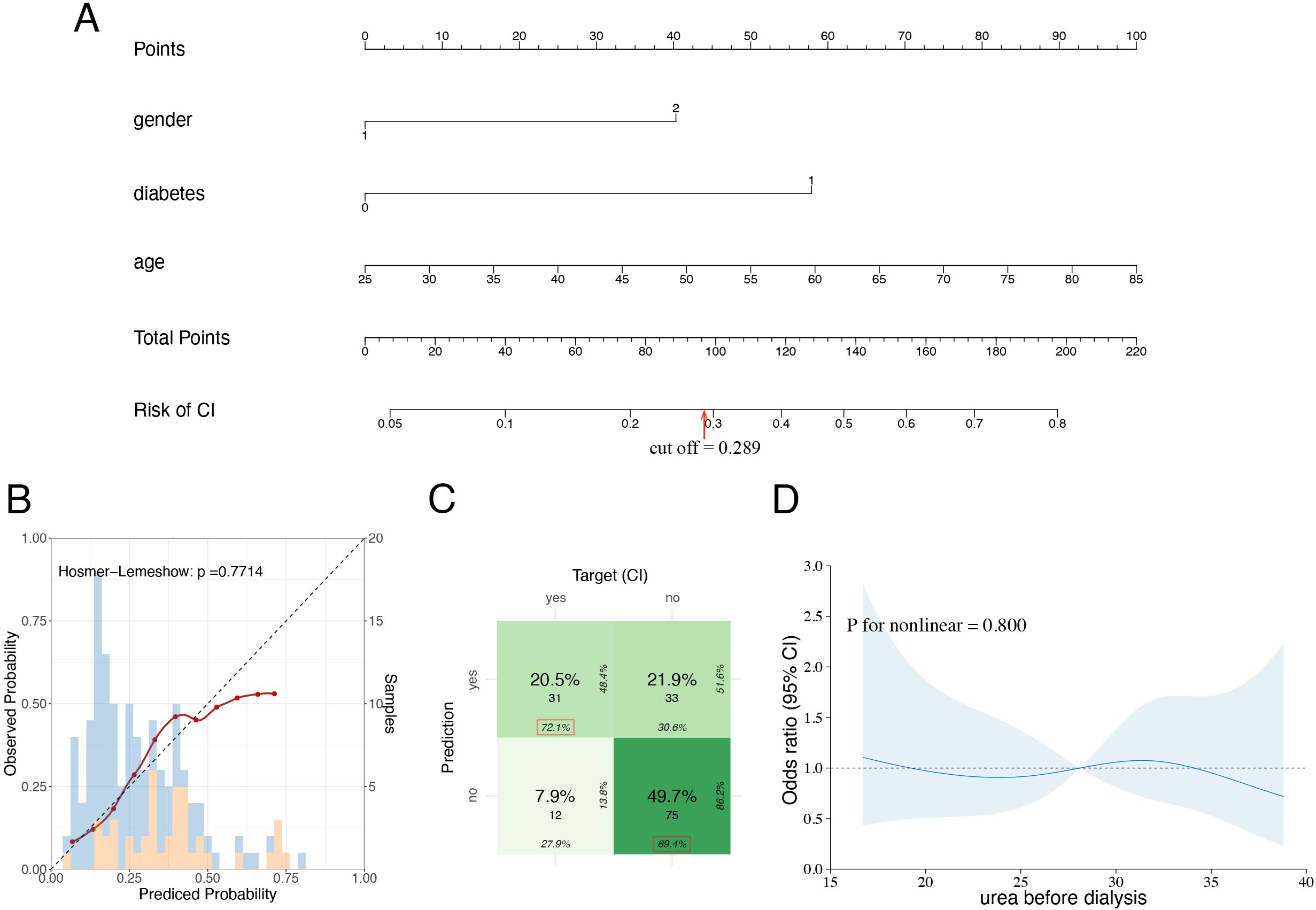Figure 4. The exhibition and evaluation of model2 and RCS plot of dialysis time. (A) The diagnostic nomogram of CI in MHD patients(model2). (B) The calibration plot of model2 and Hosmer-Lemeshow test. Blue: the histogram of patients without CI; orange: the histogram of patients with CI. (C) The confusion matrix of model2; the cut-off value was 0.289, with a sensitivity of 0.721 and specificity of 0.694. (D) Restricted cubic spline plot of dialysis duration.