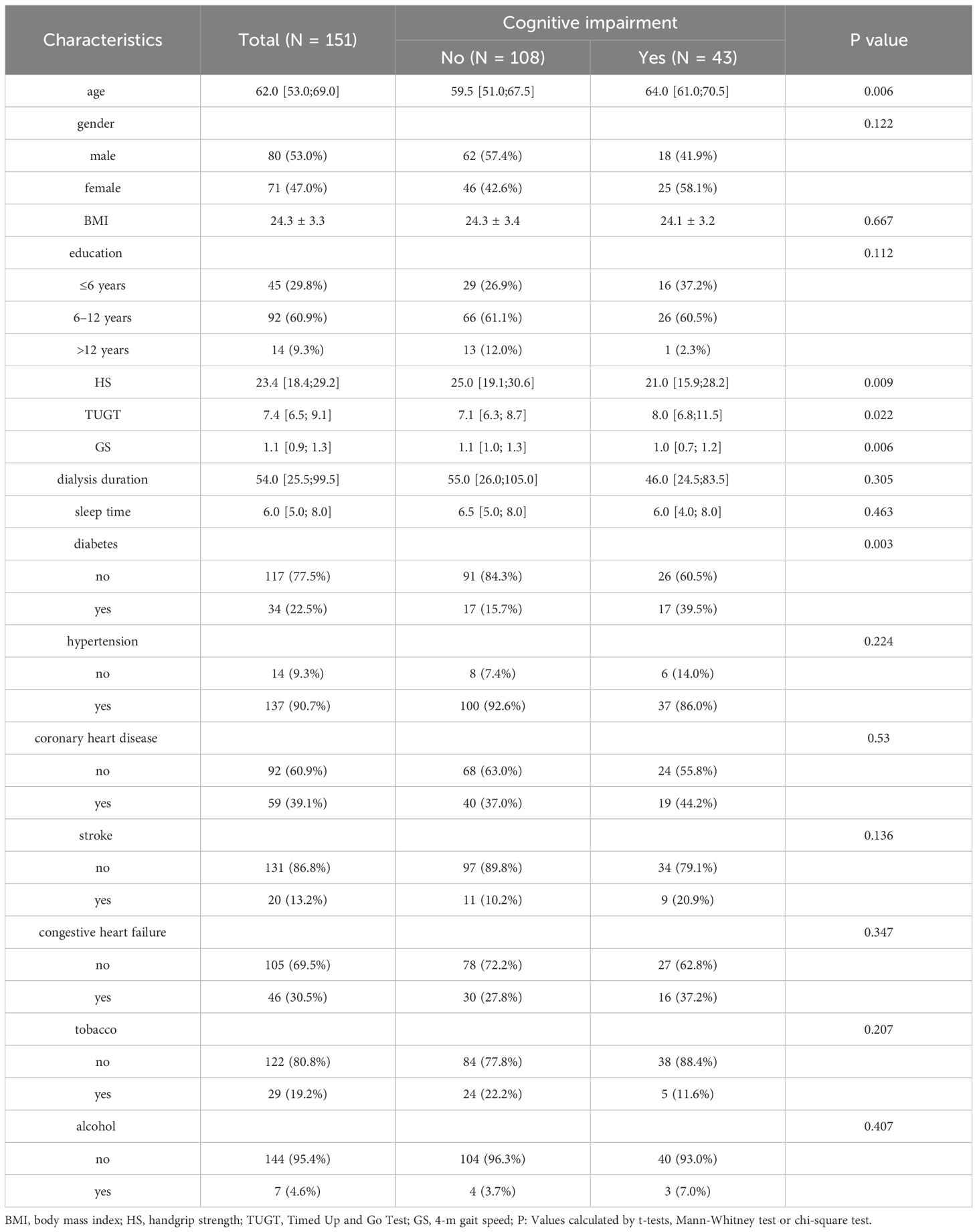 A total of 151 patients who underwent MHD at the blood purification center were included in this study. The baseline clinical, biochemical and physical characteristics are shown in Table 1–1 and Table 1-2. The median age of the study patients was 62.0 years (IQR: 53.0-69.0 years), and males accounted for 53.0%. Among MHD patients, 43 (28.5%) had CI. The median dialysis duration was 54.0 months (IQR: 25.5–99.5 months).