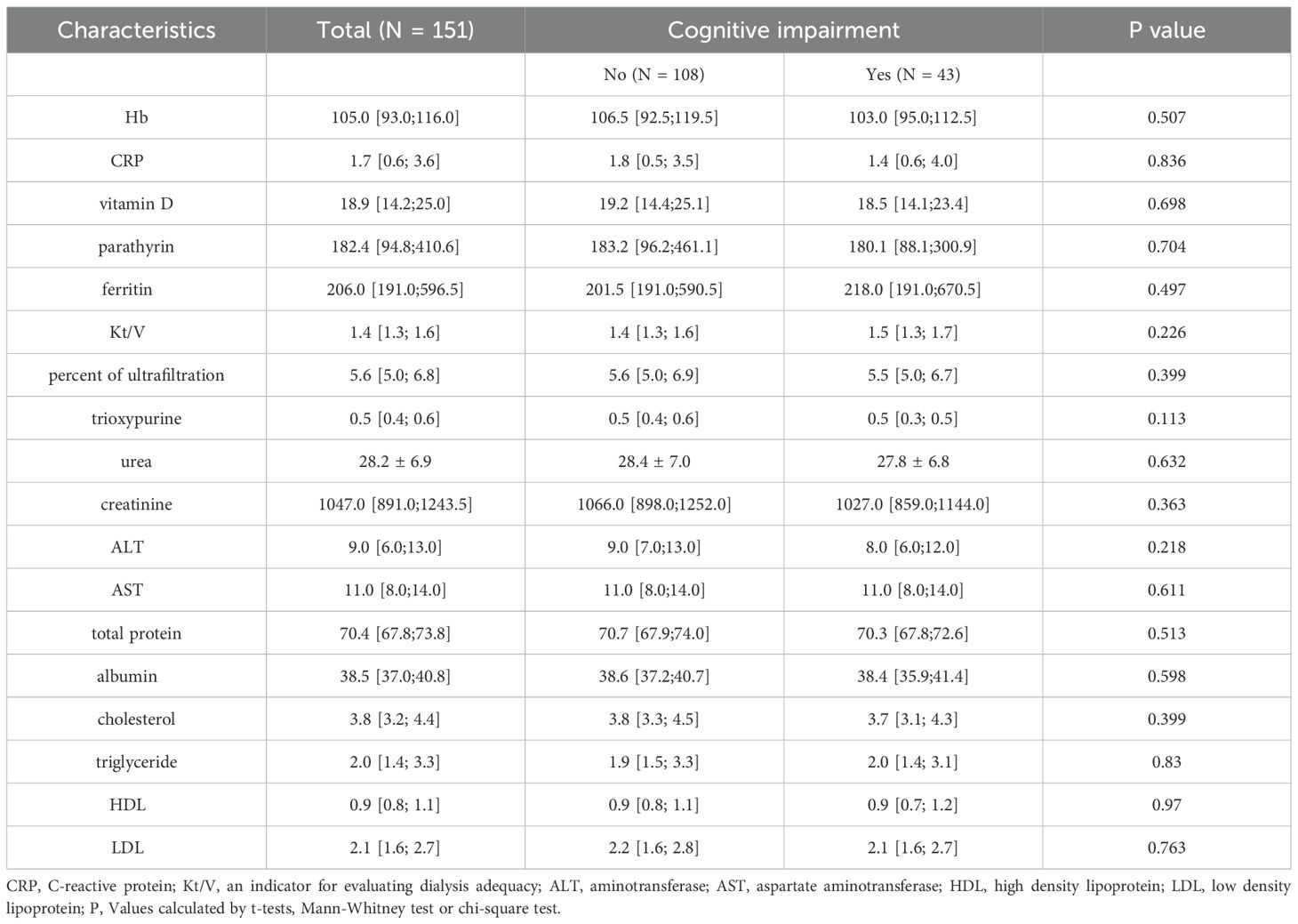In addition, the association between dialysis duration and CI remains controversial. Currently, there is a perspective suggesting that with increasing dialysis duration, repeated circulatory stress during hemodialysis may contribute to ischemic brain injury. This is largely due to recurrent cerebral hypoperfusion during hemodialysis, which can accelerate cognitive decline (38). Ding Chen et al. reported that a dialysis duration of ≥5 years was associated with an increased risk of CI (16). In contrast, there was no statistically significant difference in dialysis duration between the CI group and the non-CI group in this study. Furthermore, these findings were validated through univariate analysis and restricted cubic spline regression. Using multiple analytical approaches, this study ultimately revealed that dialysis duration was not associated with CI. Therefore, controversy remains concerning the association between hemodialysis duration and CI in MHD patients. However, each dialysis session differs in terms of frequency, adequacy, dialysate temperature, and even the type of dialyzer, all of which may influence dialysis outcomes. Therefore, further longitudinal studies may be needed to clarify the relationship between hemodialysis duration and CI.
