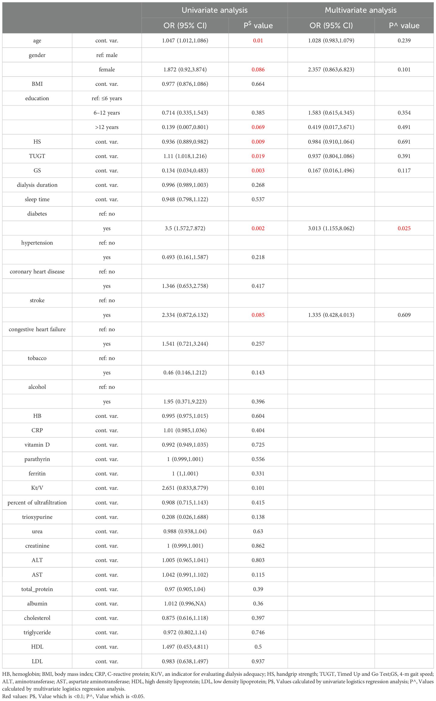 For other variables, such as body mass index (BMI), dialysis duration, hypertension, coronary heart disease, congestive heart failure, tobacco use, alcohol consumption, Hb, CRP, vitamin D, parathyrin, ferritin, Kt/V, urea, creatinine, liver enzymes (ALT, AST), total protein, albumin, cholesterol, triglycerides, HDL, and LDL, no statistically significant differences were detected in the univariate analysis.