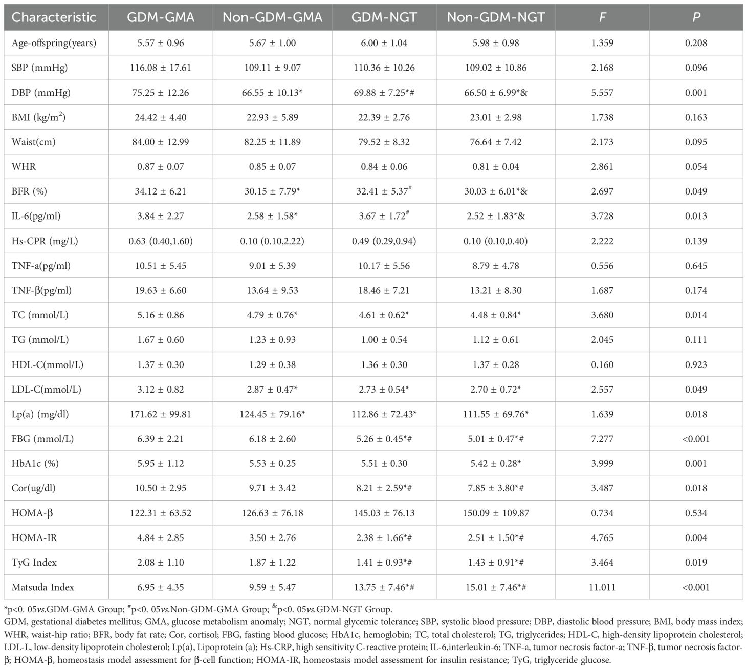 Table 1 summarizes the baseline characteristics of the four study groups (GDM-GMA, Non-GDM-GMA, GDM-NGT, and Non-GDM-NGT). Women with prior GDM, regardless of subsequent glucose metabolism status (GMA or NGT), exhibited significantly higher DBP compared to non-GDM groups[(75.25 ± 12.26,69.88 ± 7.25)vs. (66.55 ± 10.13,66.50 ± 6.99), p = 0.001]. BFR was elevated in the GDM group at 4–7 years postpartum[(34.12 ± 6.21,32.41 ± 5.37)vs. (30.15 ± 7.79,30.03 ± 6.01), p=0.049].IL-6 levels were significantly higher in the GDM group [(3.84 ± 2.27,3.67 ± 1.72)vs. (2.58 ± 1.58,2.52 ± 1.83),p=0.013]. The GDM-GMA subgroup showed elevated TC[(5.16 ± 0.86)vs. (4.79 ± 0.76,4.61 ± 0.62,4.48 ± 0.84),p=0.014], LDL-C[(3.12 ± 0.82)vs.(2.87 ± 0.47,2.73 ± 0.54,2.70 ± 0.72),p=0.040], and Lp(a)[(171.62 ± 99.81)vs.(124.45 ± 79.16,112.86 ± 72.43,111.55 ± 69.76),p=0.018]levels compared to other groups. Subjects with GMA (regardless of GDM history) demonstrated higher FBG compared to the NGT groups [(6.39 ± 2.21, 6.18 ± 2.60) vs. (5.26 ± 0.45,5.01 ± 0.47),p< 0.001]. HbA1c levels differed significantly only between GDM-GMA and Non-GDM-NGT groups (5.95 ± 1.12vs.5.42 ± 0.28,p = 0.001). GMA groups exhibited elevated cortisol levels [(10.50 ± 2.95,9.71 ± 3.42)vs.(8.21 ± 2.59,7.85 ± 3.80),p< 0.05] and increased IR indices:HOMA-IR [(4.84 ± 2.85,3.50 ± 2.76)vs.(2.38 ± 1.66,2.51 ± 1.50), p=0.004], TyG index [(2.08 ± 1.10,1.87 ± 1.22)vs.(1.41 ± 0.93,1.43 ± 0.91),p=0.019], and Matsuda index [(6.95 ± 4.35,9.59 ± 5.47)vs.(13.75 ± 7.46,15.01 ± 7.46),p<0.001].